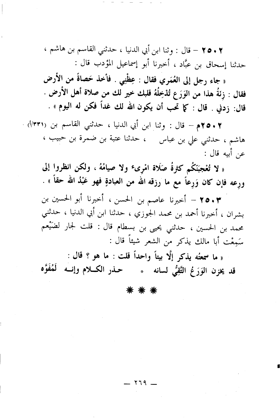 2502- قال: وثنا ابن أبي الدنيا، حدثني القاسم بن هاشم، حدثنا إسحاق بن عباد، أخبرنا أبو إسماعيل المؤدب قال: