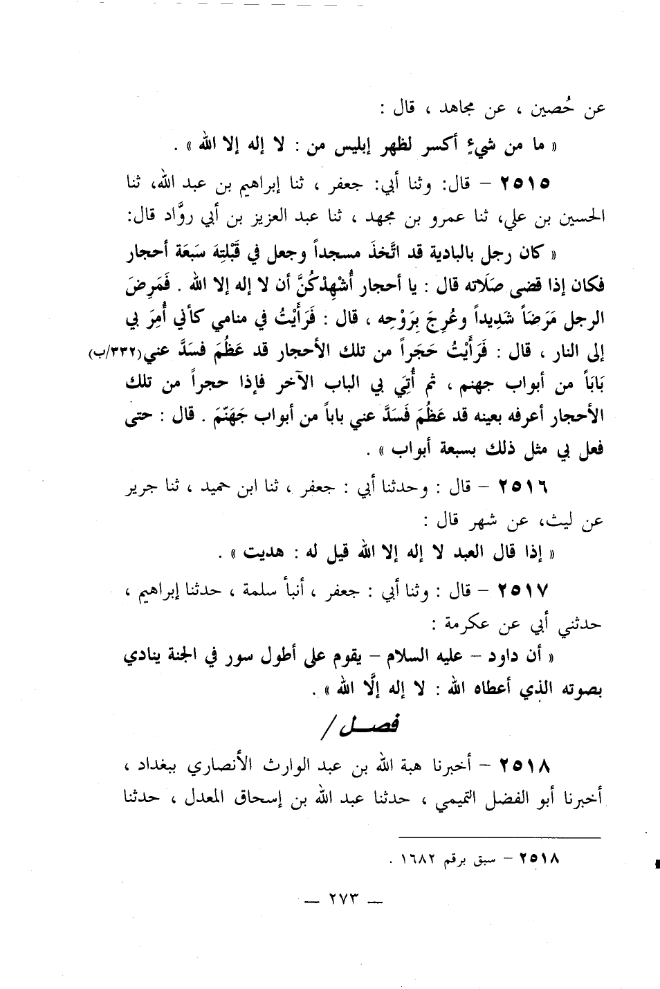 2515- قال: وثنا أبي: جعفر، ثنا إبراهيم بن عبد الله، ثنا الحسين بن علي، ثنا عمرو بن مجهد، ثنا عبد العزيز بن أبي رواد قال: