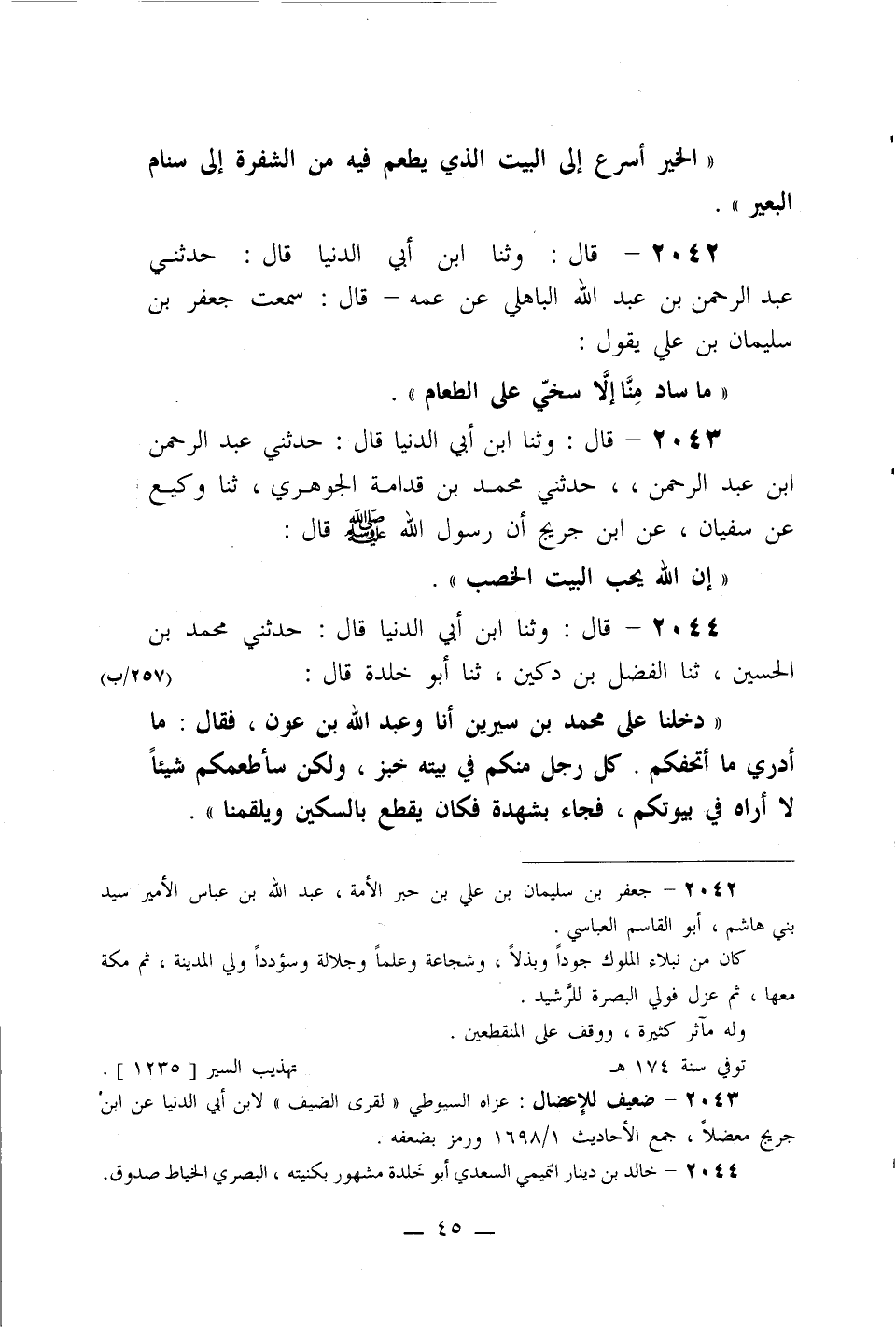2042- قال: وثنا ابن أبي الدنيا قال: حدثني عبد الرحمن بن عبد الله الباهلي عن عمه – قال: سمعت جعفر بن سليمان بن علي يقول: