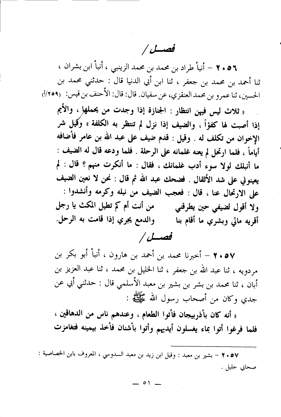2057- أخبرنا محمد بن أحمد بن هارون، أنبأ أبو بكر بن مردويه، ثنا عبد الله بن جعفر، ثنا الخليل بن محمد، ثنا عبد العزيز بن أبان، ثنا محمد بن بشر بن بشير بن معبد الأسلمي قال: حدثني أبي عن جدي وكان من أصحاب رسول الله صلى الله عليه وسلم: