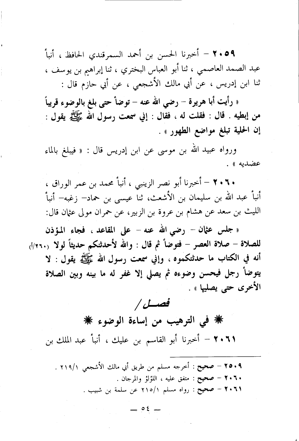 2060- أخبرنا أبو نصر الزينبي، أنبأ محمد بن عمر الوراق، أنبأ عبد الله بن سليمان بن الأشعث، ثنا عيسى بن حماد –زغبه- أنبأ الليث بن سعد عن هشام بن عروة بن الزبير، عن حمران مولى عثمان قال: