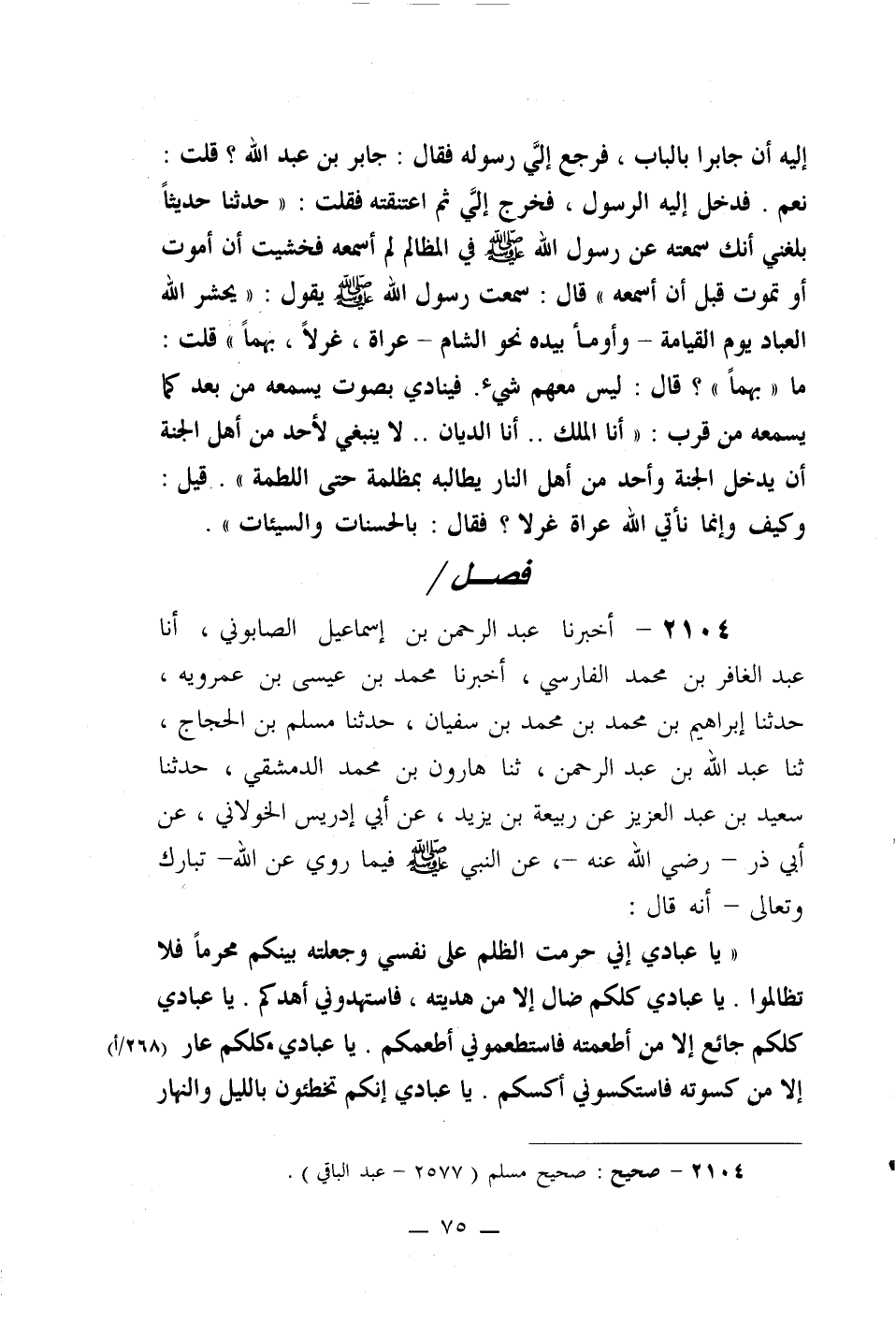 2104- أخبرنا عبد الرحمن بن إسماعيل الصابوني، أنا عبد الغافر بن محمد الفارسي، أخبرنا محمد بن عيسى بن عمرويه، حدثنا إبراهيم بن محمد بن محمد بن سفيان، حدثنا مسلم بن الحجاج، ثنا عبد الله بن عبد الرحمن، ثنا هارون بن محمد الدمشقي، حدثنا سعيد بن عبد العزيز عن ربيعة بن يزيد، عن أبي إدريس الخولاني، عن أبي ذر –رضي الله عنه-، عن النبي صلى الله عليه وسلم فيما روي عن الله –تبارك وتعالى- أنه قال:
