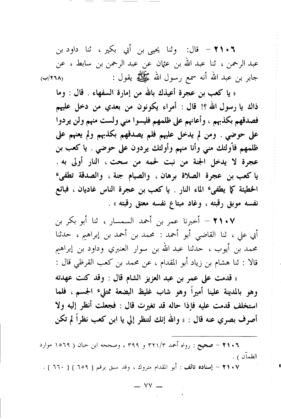 ((يا كعب بن عجرة أعيذك بالله من إمارة السفهاء. قال: وما ذاك يا رسول الله؟! قال: أمراء يكونون من بعدي من دخل عليهم فصدقهم بكذبهم، وأعانهم على ظلمهم فليسوا مني ولست منهم ولن يردوا على حوضي. ومن لم يدخل عليهم فلم يصدقهم بكذبهم ولم يعنهم على ظلمهم فأولئك مني وأنا منهم وأولئك يردون على حوضي. يا كعب بن عجرة لا يدخل الجنة من نبت لحمه من سحت، النار أولى به. يا كعب بن عجرة الصلاة برهان، والصيام جنة، والصدقة تطفئ الخطيئة كما يطفئ الماء النار. يا كعب بن عجرة الناس غاديان، فبائع نفسه موبق رقبته، وغاد مبتاع نفسه معتق رقبته)) .