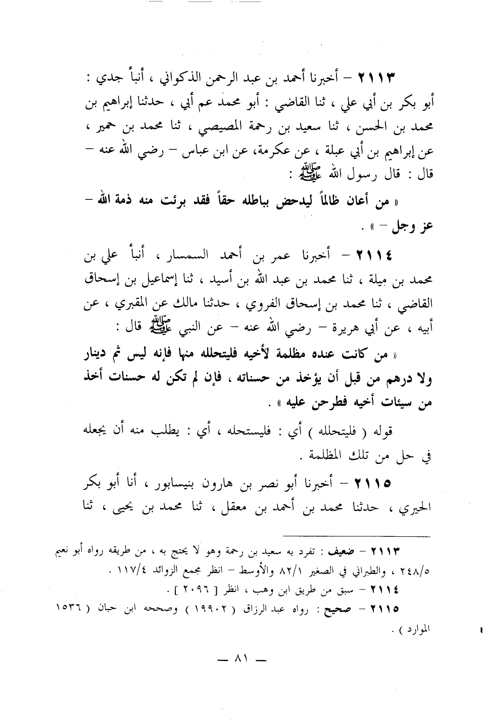 2113- أخبرنا أحمد بن عبد الرحمن الذكواني، أنبأ جدي: أبو بكر بن أبي علي، ثنا القاضي: أبو محمد عم أبي، حدثنا إبراهيم بن محمد بن الحسن، ثنا سعيد بن رحمة المصيصي، ثنا محمد بن حمير، عن إبراهيم بن أبي عبلة، عن عكرمة، عن ابن عباس –رضي الله عنه- قال: قال رسول الله صلى الله عليه وسلم: