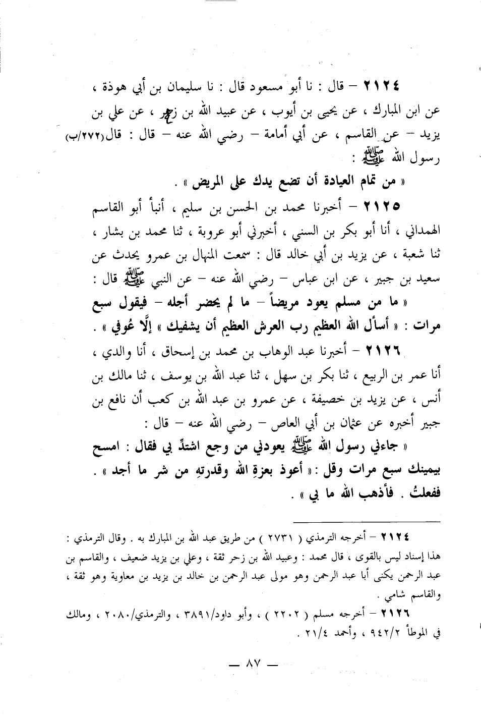 ((ما من مسلم يعود مريضاً –ما لم يحضر أجله- فيقول سبع مرات: ((أسأل الله العظيم رب العرش العظيم أن يشفيك)) إلا عوفي)) .