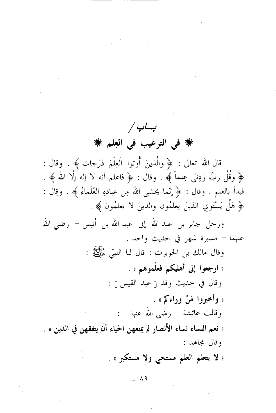 قال الله تعالى: {والذين أوتوا العلم درجات} . وقال: {وقل رب زدني علماً} . وقال: {فاعلم أنه لا إله إلا الله} . فبدأ بالعلم. وقال: {إنما يخشى الله من عباده العلماء} . وقال: {هل يستوي الذين يعلمون والذين لا يعلمون} .