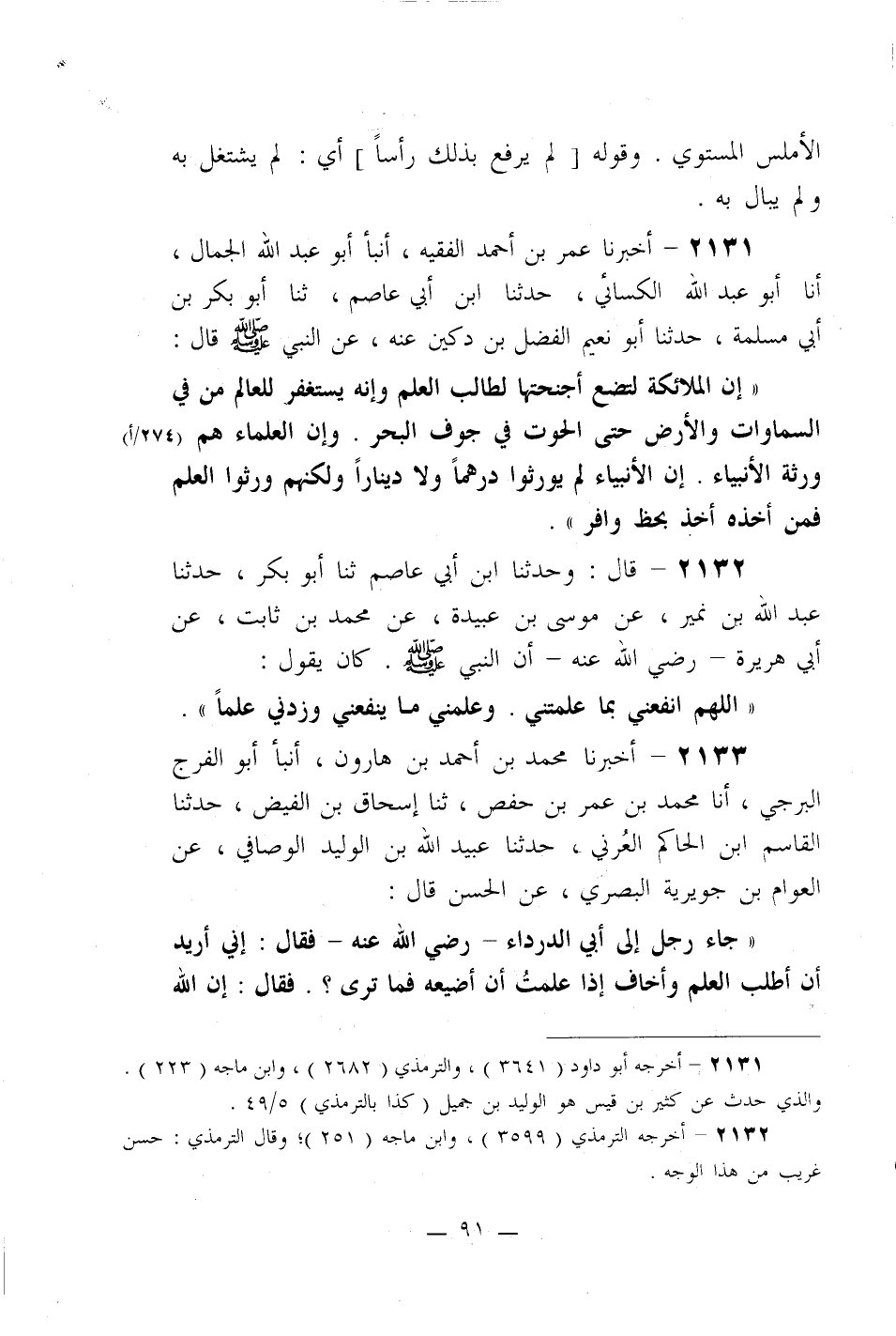 ((إن الملائكة لتضع أجنحتها لطالب العلم وإنه يستغفر للعالم من في السماوات والأرض حتى الحوت في جوف البحر. وإن العلماء هم ورثة الأنبياء. إن الأنبياء لم يورثوا درهماً ولا ديناراً ولكنهم ورثوا العلم فمن أخذه أخذ بحظ وافر)) .