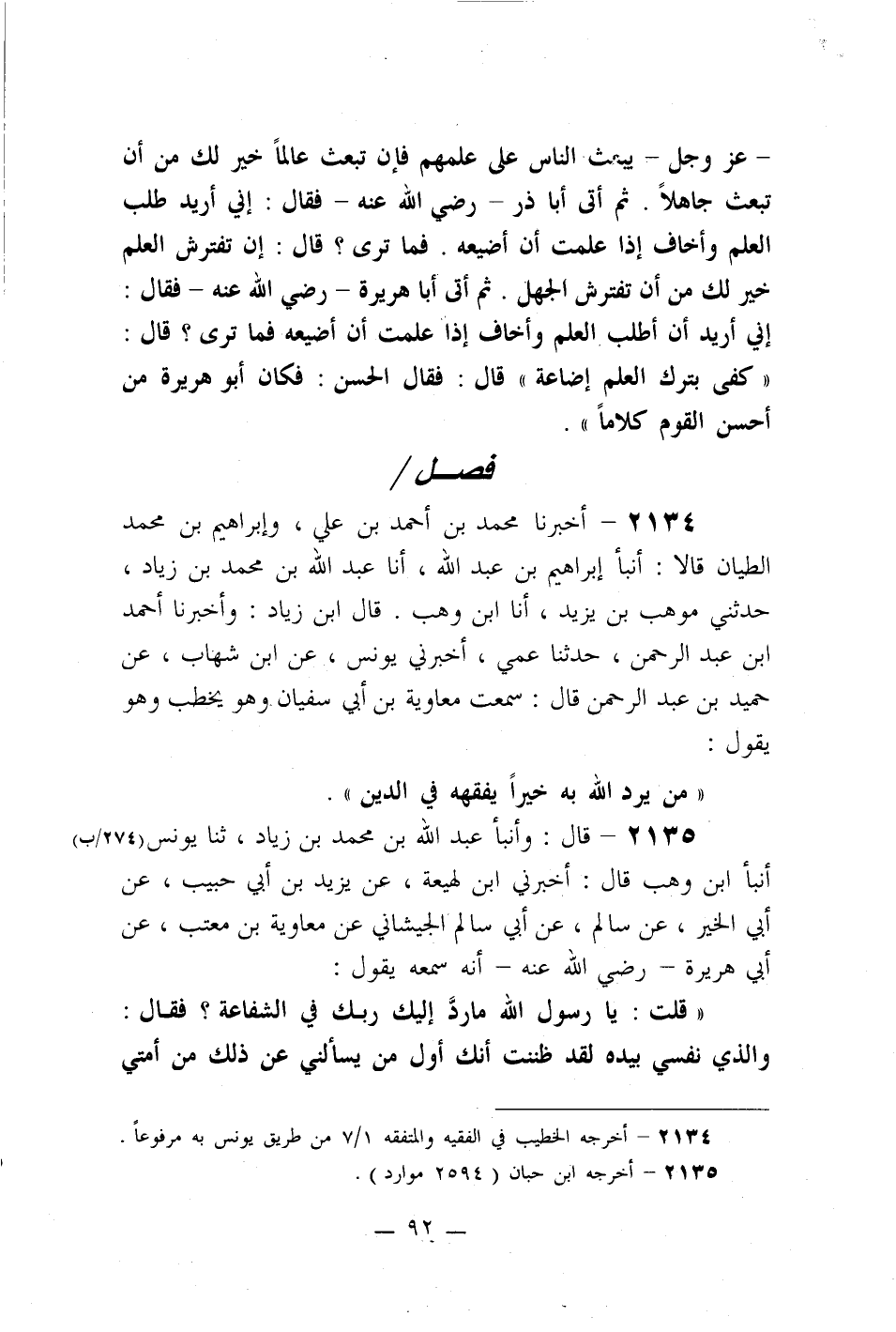 2135- قال: وأنبأ عبد الله بن محمد بن زياد، ثنا يونس أنبأ ابن وهب قال: أخبرني ابن لهيعة، عن يزيد بن أبي حبيب، عن أبي الخير، عن سالم، عن أبي سالم الجيشاني عن معاوية بن معتب، عن أبي هريرة –رضي الله عنه- أنه سمعه يقول: