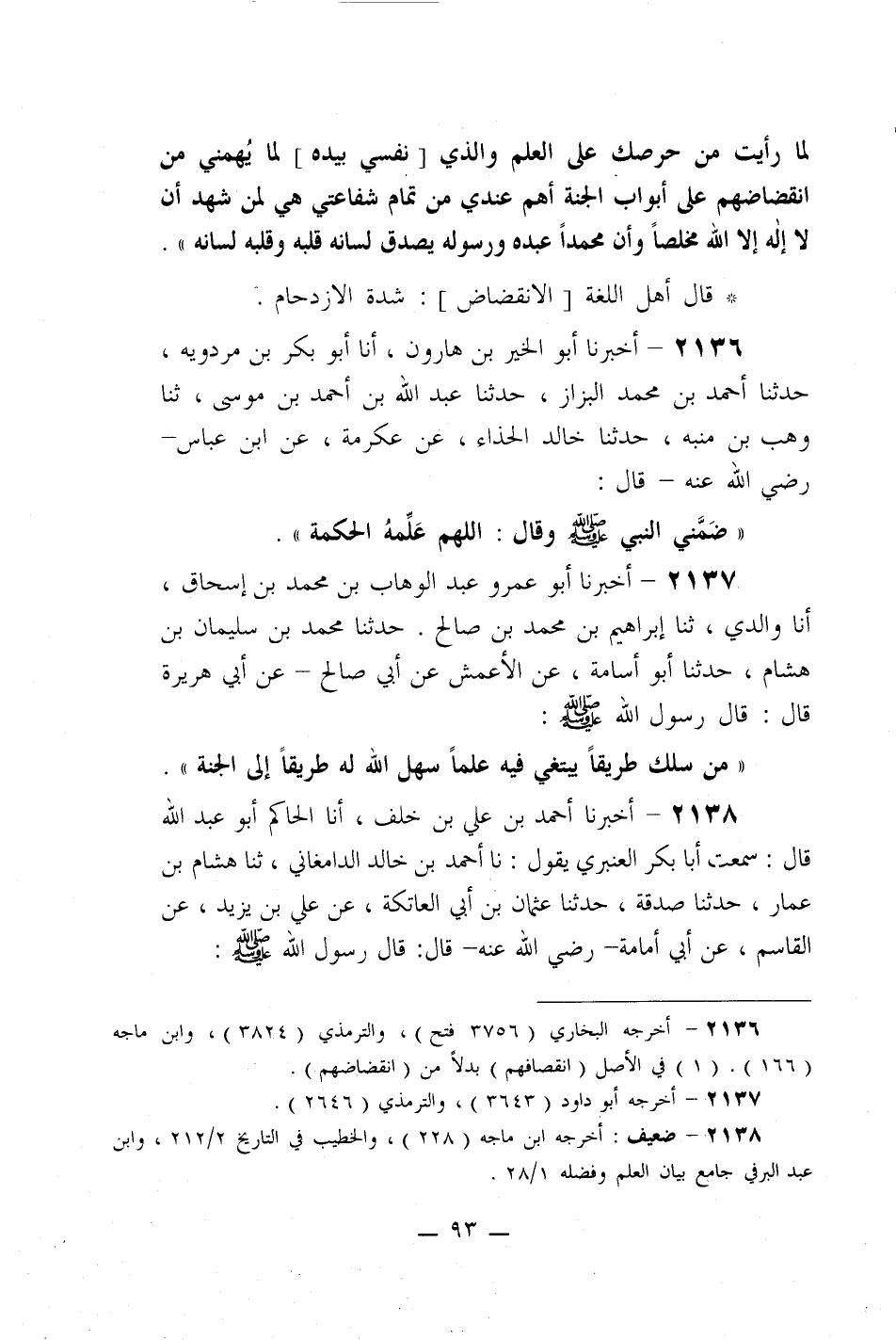 -[94]- ((عليكم بهذا العلم قبل أن يقبض وقبل أن يرفع، ثم جمع بين إصبعيه الوسطي والتي تلي الإبهام هكذا ثم قال: العالم والمتعلم شريكان –يعني في الأجر- ولا خير في سائر الناس بعد)) .
