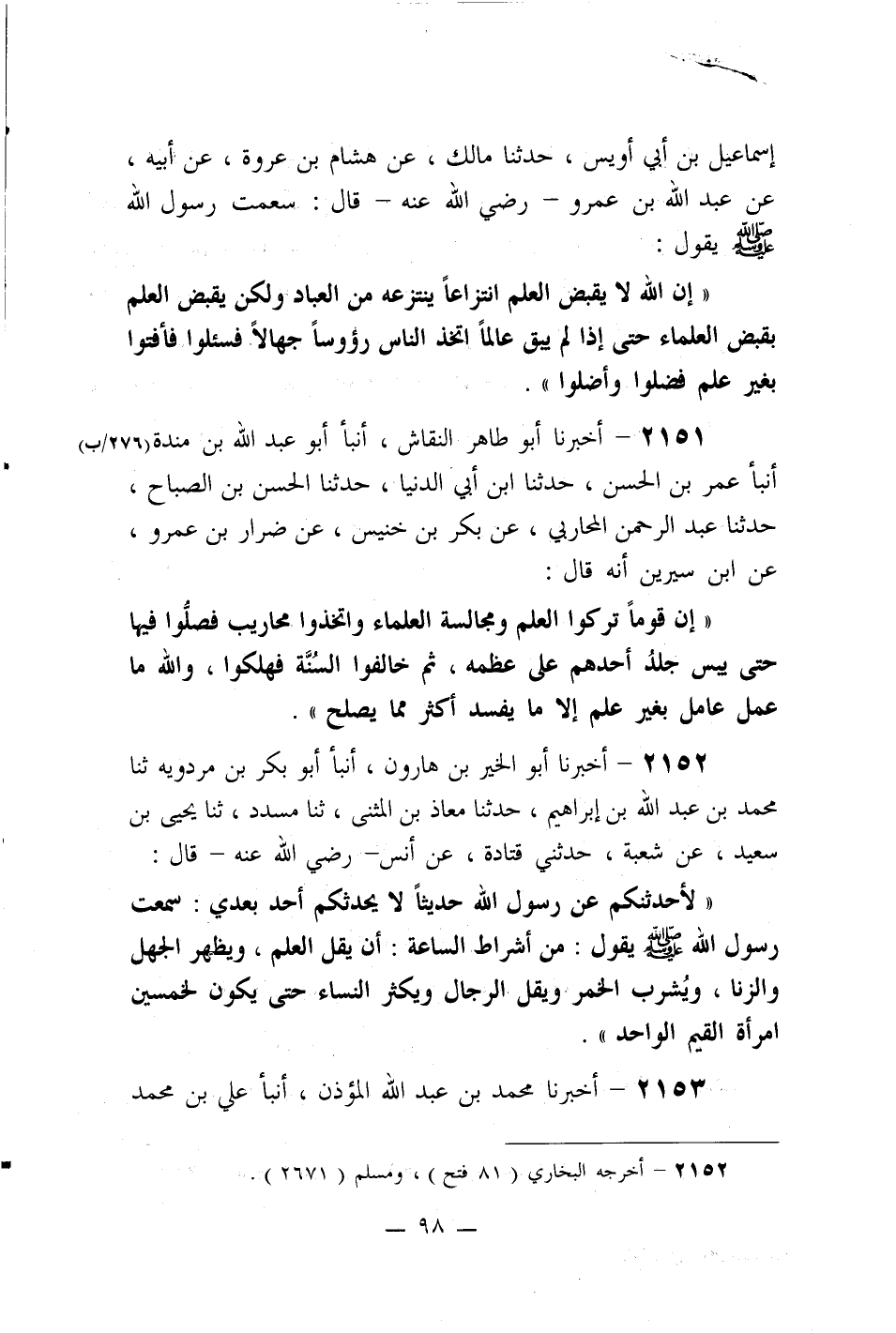 2151- أخبرنا أبو طاهر النقاش، أنبأ أبو عبد الله بن مندة، أنبأ عمر بن الحسن، حدثنا ابن أبي الدنيا، حدثنا الحسن بن الصباح، حدثنا عبد الرحمن المحاربي، عن بكر بن خنيس، عن ضرار بن عمرو، عن ابن سيرين أنه قال: