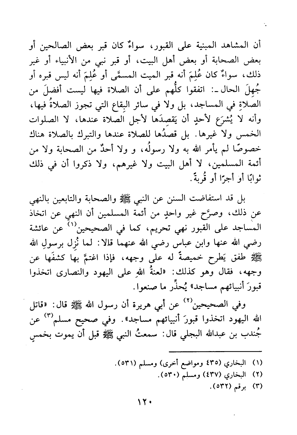 وفي الصحيحين (2) عن أبي هريرة أن رسول الله - صَلَّى اللَّهُ عَلَيْهِ وَسَلَّمَ - قال: "قاتل الله اليهود اتخذوا قبورَ أنبيائهم مساجد". وفي صحيح مسلم (3) عن جُندب بن عبد الله البجلي قال: سمعتُ النبي - صَلَّى اللَّهُ عَلَيْهِ وَسَلَّمَ - قبل أن يموت بخمسٍ