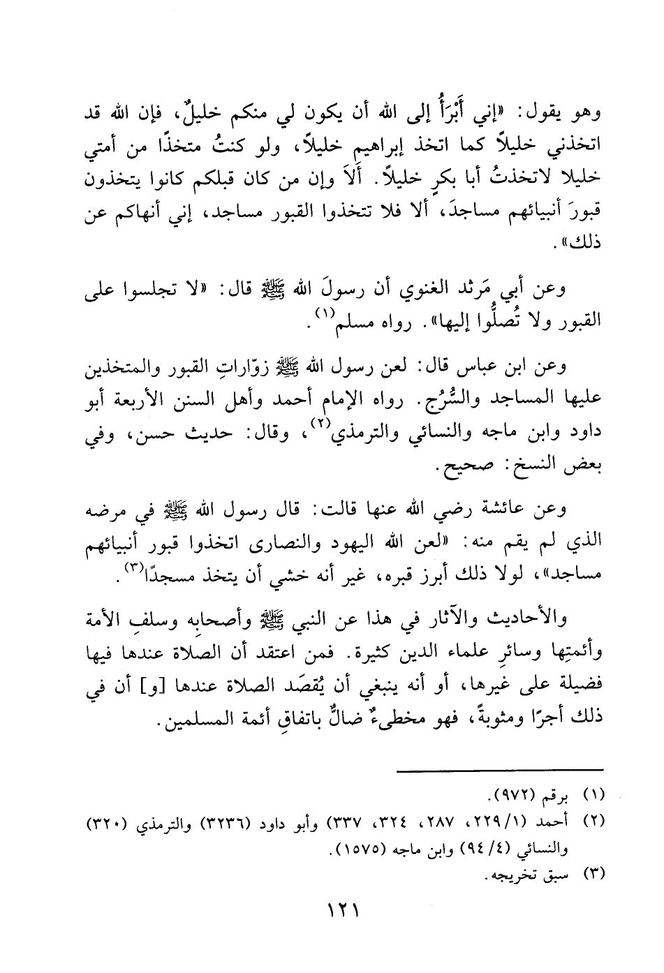 وعن ابن عباس قال: لعن رسول الله - صَلَّى اللَّهُ عَلَيْهِ وَسَلَّمَ - زوَّاراتِ القبور والمتخذين عليها المساجد والسُّرُج. رواه الإمام أحمد وأهل السنن الأربعة أبو داود وابن ماجه والنسائي والترمذي (2)، وقال: حديث حسن، وفي بعض النسخ: صحيح.