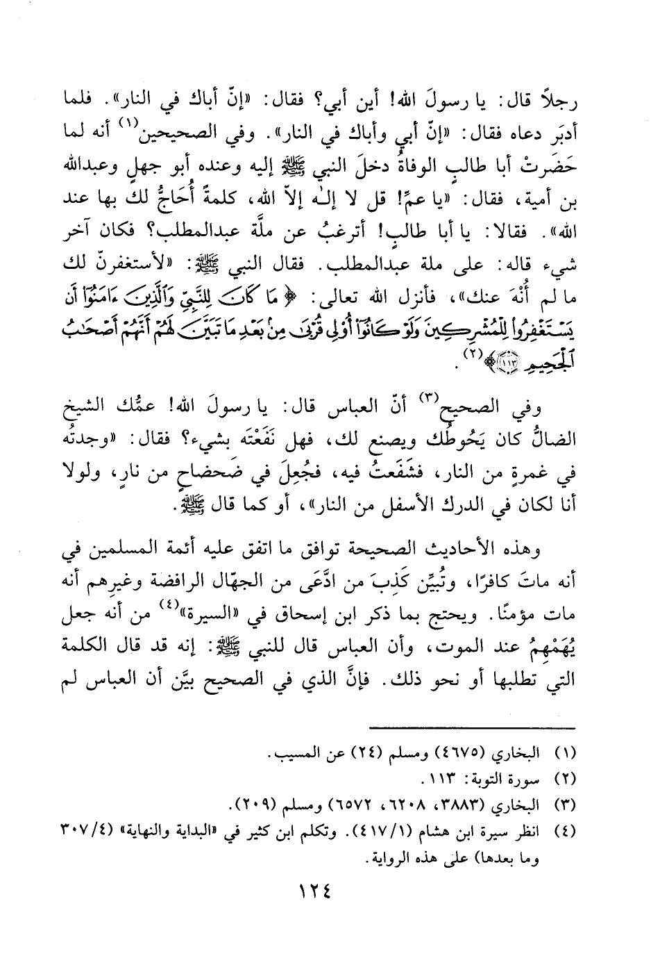 رجلاً قال: يا رسولَ الله! أين أبي؟ فقال: "إنّ أباك في النار". فلما أدبَر دعاه فقال: "إنّ أبي وأباك في النار". وفي الصحيحين (1) أنه لما حَضرتْ أبا طالب الوفاة دخلَ النبي - صَلَّى اللَّهُ عَلَيْهِ وَسَلَّمَ - إليه وعنده أبو جهلٍ وعبد الله بن أمية، فقال: "يا عمِّ! قل لا إله إلا الله، كلمةً أُحَاجُّ لك بها عند الله". فقالا: يا أبا طالبٍ! أترغبُ عن ملَّة عبد المطلب؟ فكان آخر شيء قاله: على ملة عبد المطلب. فقال النبي - صَلَّى اللَّهُ عَلَيْهِ وَسَلَّمَ -: "لأستغفرنّ لك ما لم أُنْهَ عنك"، فأنزل الله تعالى: (مَا كَانَ لِلنَّبِيِّ وَالَّذِينَ آمَنُوا أَنْ يَسْتَغْفِرُوا لِلْمُشْرِكِينَ وَلَوْ كَانُوا أُولِي قُرْبَى مِنْ بَعْدِ مَا تَبَيَّنَ لَهُمْ أَنَّهُمْ أَصْحَابُ الْجَحِيمِ (113)) (2).
