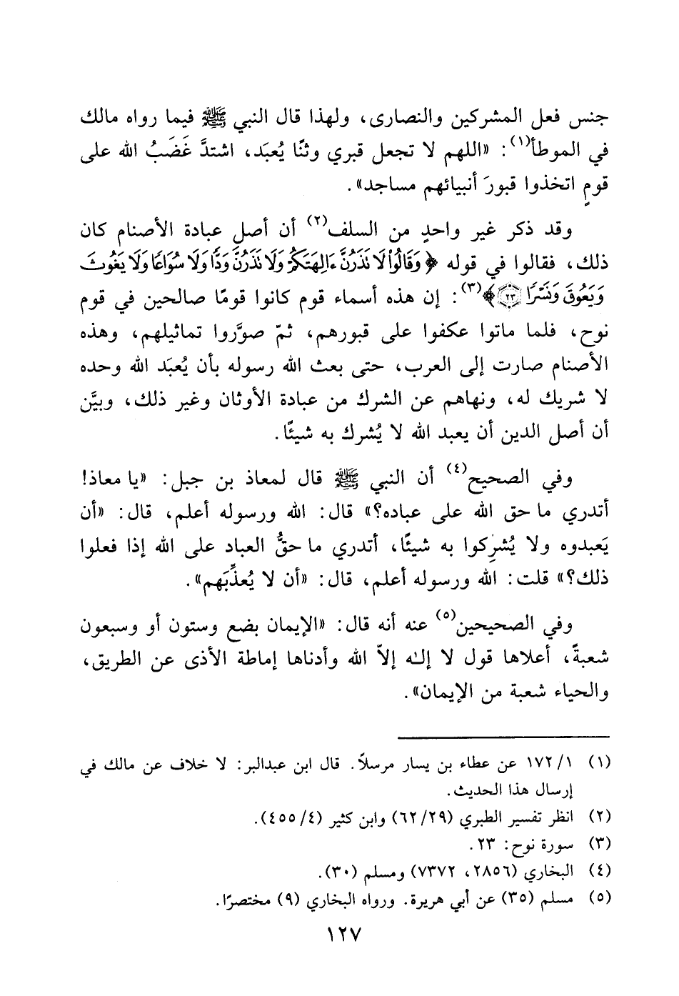 وقد ذكر غير واحدٍ من السلف (2) أن أصل عبادة الأصنام كان ذلك، فقالوا في قوله (وَقَالُوا لا تَذَرُنَّ آلِهَتَكُمْ وَلا تَذَرُنَّ وَدّاً وَلا سُوَاعاً وَلا يَغُوثَ وَيَعُوقَ وَنَسْراً (23)) (3): إن هذه أسماء قوم كانوا قومًا صالحين في قوم نوح، فلما ماتوا عكفوا على قبورهم، ثمّ صوَّروا تماثيلهم، وهذه الأصنام صارت إلى العرب، حتى بعث الله رسوله بأن يُعبَد الله وحده لا شريك له، ونهاهم عن الشرك من عبادة الأوثان وغير ذلك، وبيَّن أن أصل الدين أن يعبد الله لا يُشرك به شيئًا.