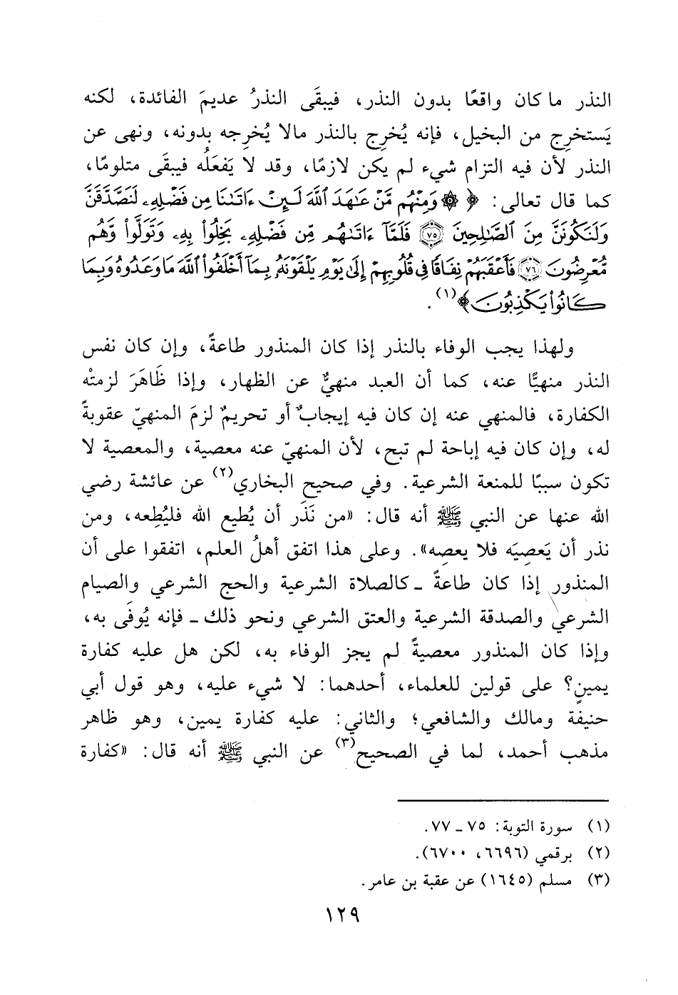ولهذا يجب الوفاء بالنذر إذا كان المنذور طاعةً، وإن كان نفس النذر منهيًّا عنه، كما أن العبد منهيٌّ عن الظهار، وإذا ظَاهَرَ لزمتْه الكفارة، فالمنهي عنه إن كان فيه إيجاب أو تحريمٌ لزمَ المنهي عقوبةً له، وإن كان فيه إباحة لم تبح، لأن المنهي عنه معصية، والمعصية لا تكون سببًا للمنعة الشرعية. وفي صحيحِ البخاري (2) عن عائشة رضي الله عنها عن النبي - صَلَّى اللَّهُ عَلَيْهِ وَسَلَّمَ - أنه قال: "من نَذر أن يُطيع الله فليُطِعه، ومن نذر أن يَعصِيَه فلا يعصِه". وعلى هذا اتفق أهلُ العلم، اتفقوا على أن المنذور إذا كان طاعةً -كالصلاة الشرعية والحج الشرعي وِالصيام الشرعي والصدقة الشرعية والعتق الشرعي ونحو ذلك- فإنه يُوفى به، وإذا كان المنذور معصيةً لم يجز الوفاء به، لكن هل عليه كفارة يمينٍ؟ على قولين للعلماء، أحدهما: لا شيء عليه، وهو قول أبي حنيفة ومالك والشافعي؟ والثاني: عليه كفارة يمين، وهو ظاهر مذهب أحمد، لما في الصحيح (3) عن النبي - صَلَّى اللَّهُ عَلَيْهِ وَسَلَّمَ - أنه قال: "كفارة