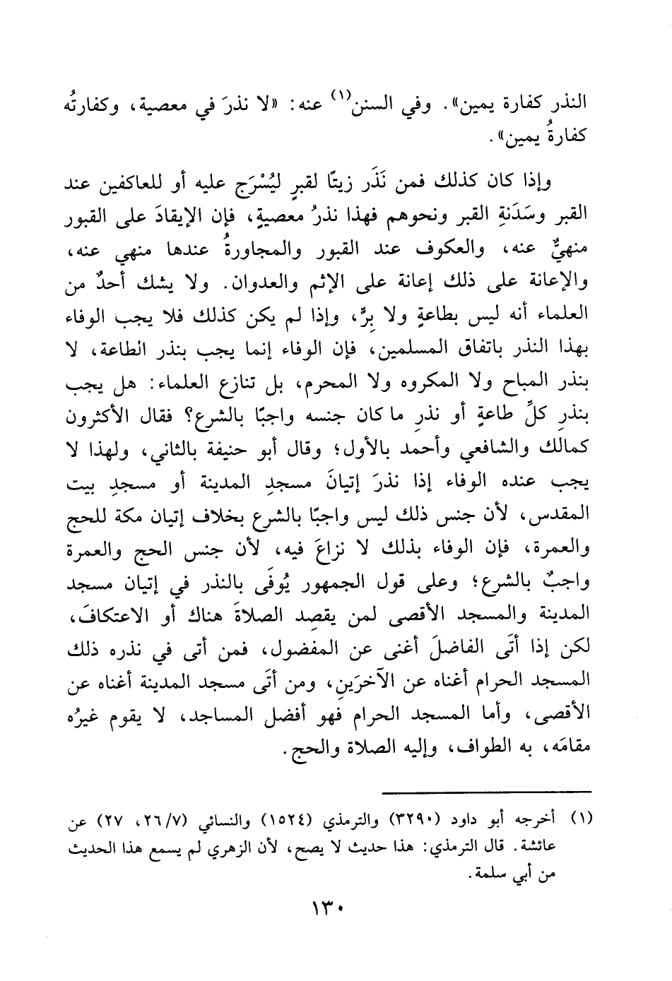 وإذا كان كذلك فمن نَذَر زيتًا لقبرٍ ليُسْرَج عليه أو للعاكفين عند القبر وسَدَنةِ القبر ونحوهم فهذا نذرُ معصيةِ، فإن الإيقادَ على القبور منهيٌّ عنه، والعكوف عند القبور والمجاورةُ عندها منهي عنه، والإعانة على ذلك إعانة على الإثم والعدوان. ولا يشك أحد من العلماء أنه ليس بطاعةٍ ولا بِرٍّ، وإذا لم يكن كذلك فلا يجب الوفاء بهذا النذر باتفاق المسلمين، فإن الوفاء إنما يجب بنذر الطاعة، لا بنذر المباح ولا المكروه ولا المحرم، بل تنازع العلماء: هل يجب بنذرِ كل طاعةٍ أو نذرِ ما كان جنسه واجبًا بالشرع؟ فقال الأكثرون كمالك والشافعي وأحمد بالأول؟ وقال أبو حنيفة بالثاني، ولهذا لا يجب عنده الوفاء إذا نذرَ إتيانَ مسجدِ المدينة أو مسجدِ بيت المقدس، لأن جنس ذلك ليس واجبًا بالشرع بخلاف إتيان مكة للحج والعمرة، فإن الوفاء بذلك لا نزاعَ فيه، لأن جنس الحج والعمرة واجب بالشرع؛ وعلى قول الجمهور يُوفَى بالنذر في إتيان مسجد المدينة والمسجد الأقصى لمن يقصِد الصلاةَ هناك أو الاعتكافَ، لكن إذا أتَى الفاضلَ أغنى عن المفضول، فمن أتى في نذره ذلك المسجد الحرام أغناه عن الآخرَينِ، ومن أتَى مسجد المدينة أغناه عن الأقصى، وأما المسجد الحرام فهو أفضل المساجد، لا يقوم غيرُه مقامَه، به الطواف، وإليه الصلاة والحج.