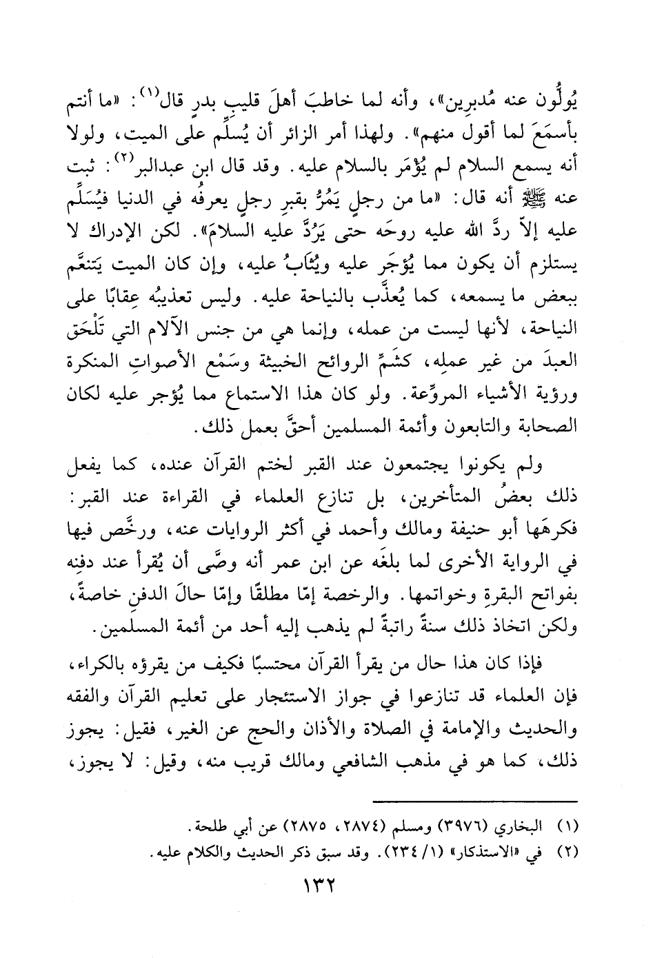 يُولُّون عنه مُدبرِين"، وأنه لما خاطبَ أهلَ قليب بدرٍ قال (1): "ما أنتم بأسمَعَ لما أقول منهم". ولهذا أمر الزائر أن يُسَلِّم على الميت، ولولا أنه يسمع السلام لم يُؤمَر بالسلام عليه. وقد قال ابن عبد البر (2): ثبت عنه - صَلَّى اللَّهُ عَلَيْهِ وَسَلَّمَ - أنه قال: "ما من رجلٍ يَمُرُّ بقبرِ رجلٍ يعرفُه في الدنيا فيُسَلِّم عليه إلا ردَّ الله عليه روحَه حتى يَرُدَّ عليه السلامَ". لكن الإدراك لا يستلزم أن يكون مما يُؤجَر عليه ويُثَابُ عليه، وإن كان الميت يَتنعَّم ببعض ما يسمعه، كما يُعذَّب بالنياحة عليه. وليس تعذيبُه عِقابًا على النياحة، لأنها ليست من عمله، وإنما هي من جنس الآلام التي تَلْحَق العبدَ من غير عملِه، كشَمِّ الروائح الخبيثة وسَمْع الأصواتِ المنكرة ورؤية الأشياء المروِّعة. ولو كان هذا الاستماع مما يُؤجر عليه لكان الصحابة والتابعون وأئمة المسلمين أحقَّ بعمل ذلك.