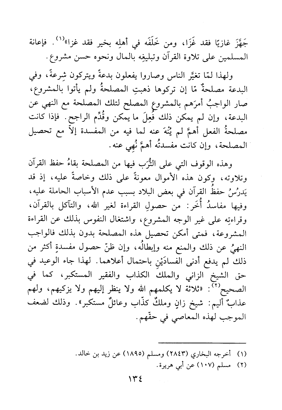وهذه الوقوف التي على التُّرَب فيها من المصلحة بقاءُ حفظ القرآن وتلاوته، وكون هذه الأموال معونةً على ذلك وخاصةً عليه، إذ قد يَدرُسُ حفظُ القرآن في بعض البلاد بسبب عدم الأسباب الحاملة عليه، وفيها مفاسدُ أُخَر: من حصولِ القراءة لغير الله، والتآكل بالقرآن، وقراءتِه على غير الوجه المشروع، واشتغال النفوس بذلك عن القراءة المشروعة، فمتى أمكن تحصيل هذه المصلحة بدون بذلك فالواجب النهيُ عن ذلك والمنع منه وإبطالُه، وإن ظنّ حصول مفسدةٍ أكثر من ذلك لم يدفع أدنى الفسادَيْنِ باحتمال أعلاهما. لهذا جاء الوعيد في حق الشيخ الزاني والملك الكذاب والفقير المستكبر، كما في الصحيح (2): "ثلاثة لا يكلمهم الله ولا ينظر إليهم ولا يزكيهم، ولهم عذاب أليم: شيخ زانٍ وملكٌ كذّا وعائلٌ مستكبر". وذلك لضعف الموجب لهذه المعاصي في حقّهم.
