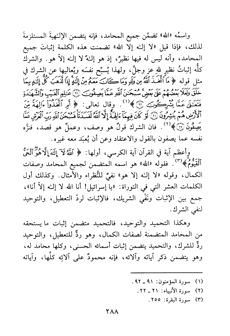 وأعظم آية في القرآن آية الكرسي، أولها: (اللَّهُ لا إِلَهَ إِلَّا هُوَ الْحَيُّ الْقَيُّومُ) (3). فقوله "الله" هو اسمه المتضمن لجميع المحامد وصفات الكمال، وقوله "لا إله إلا هو" نفي للنُّظراء والأمثال. وكذلك أول الكلمات العشر التي في التوراة: "يا إسرائيل! أنا الله لا إله إلا أنا"، جمع بين الإثبات ونَفْي الشريك، فالإثبات لردّ التعطيل، والتوحيد لنفي الشرك.