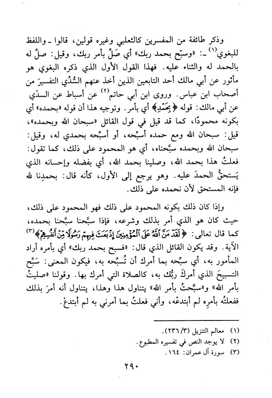 وذكر طائفة من المفسرين كالثعلبي وغيره قولين، قالوا -واللفظ للبغوي (1) -: "وسبّح بحمد ربك" أي صَلِّ بأمر ربك، وقيل: صلِّ له بالحمد له والثناء عليه. فهذا القول الأول الذي ذكره البغوي هو مأثور عن أبي مالك أحد التابعين الذين أخذ عنهم السُّدِّي التفسيرَ من أصحاب ابن عباس. وروى ابن أبي حاتم (2) عن أسباط عن السدّي عن أبي مالك: قوله (بِحَمْدِ) أي بأمر. وتوجيه هذا أن قوله "بحمده" أي بكونه محمودًا، كما قد قيل في قول القائل "سبحان الله وبحمده"، قيل: سبحان الله ومع حمده أسبِّحه، أو أسبِّحه بحمدي له، وقيل: سبحان الله وبحمده سبَّحناه، أي هو المحمود على ذلك، كما تقول: فعلتُ هذا بحمد الله، وصلينا بحمد الله، أي بفضله وإحسانه الذي يَستحقُّ الحمدَ عليه. وهو يرجع إلى الأول، كأنه قال: بحمدِنا الله فإنه المستحق لأن نحمده على ذلك.