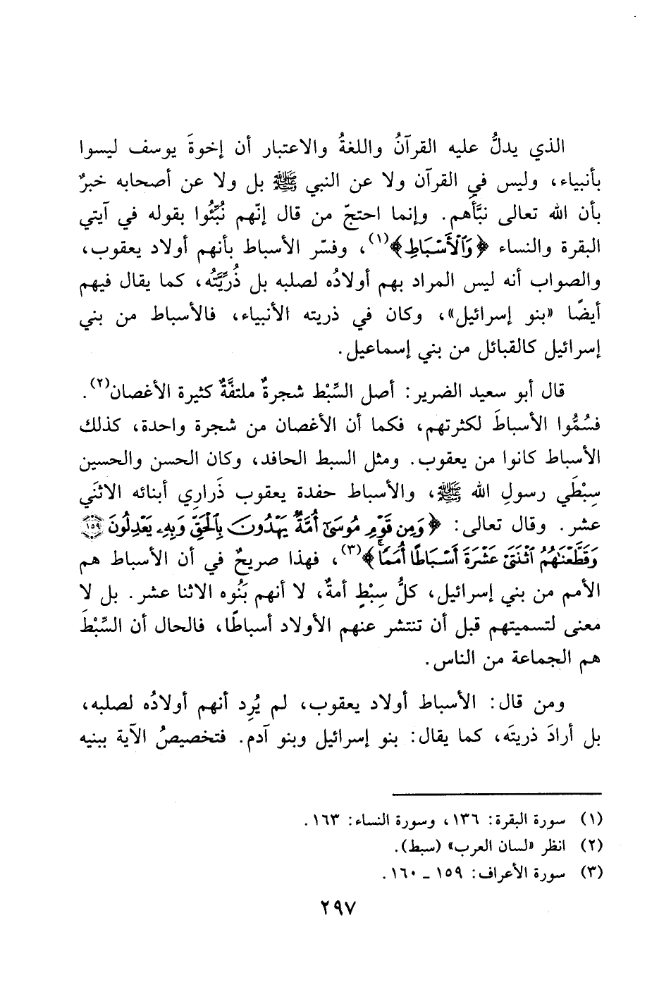 فسُمُّوا الأسباطَ لكثرتهم، فكما أن الأغصان من شجرة واحدة، كذلك الأسباط كانوا من يعقوب. ومثل السبط الحافد، وكان الحسن والحسين سِبْطَي رسولِ الله - صَلَّى اللَّهُ عَلَيْهِ وَسَلَّمَ -، والأسباط حفدة يعقوب ذَرارِي أبنائه الاثنَي عشر. وقال تعالى: (وَمِنْ قَوْمِ مُوسَى أُمَّةٌ يَهْدُونَ بِالْحَقِّ وَبِهِ يَعْدِلُونَ (159) وَقَطَّعْنَاهُمُ اثْنَتَيْ عَشْرَةَ أَسْبَاطاً أُمَماً) (3)، فهذا صريحٌ في أن الأسباط هم الأمم من بني إسرائيل، كلُ سِبْطٍ أمةٌ، لا أنهم بَنُوه الاثنا عشر. بل لا معنى لتسميتهم قبل أن تنتشر عنهم الأولاد أسباطًا، فالحال أن السِّبْطَ هم الجماعة من الناس.