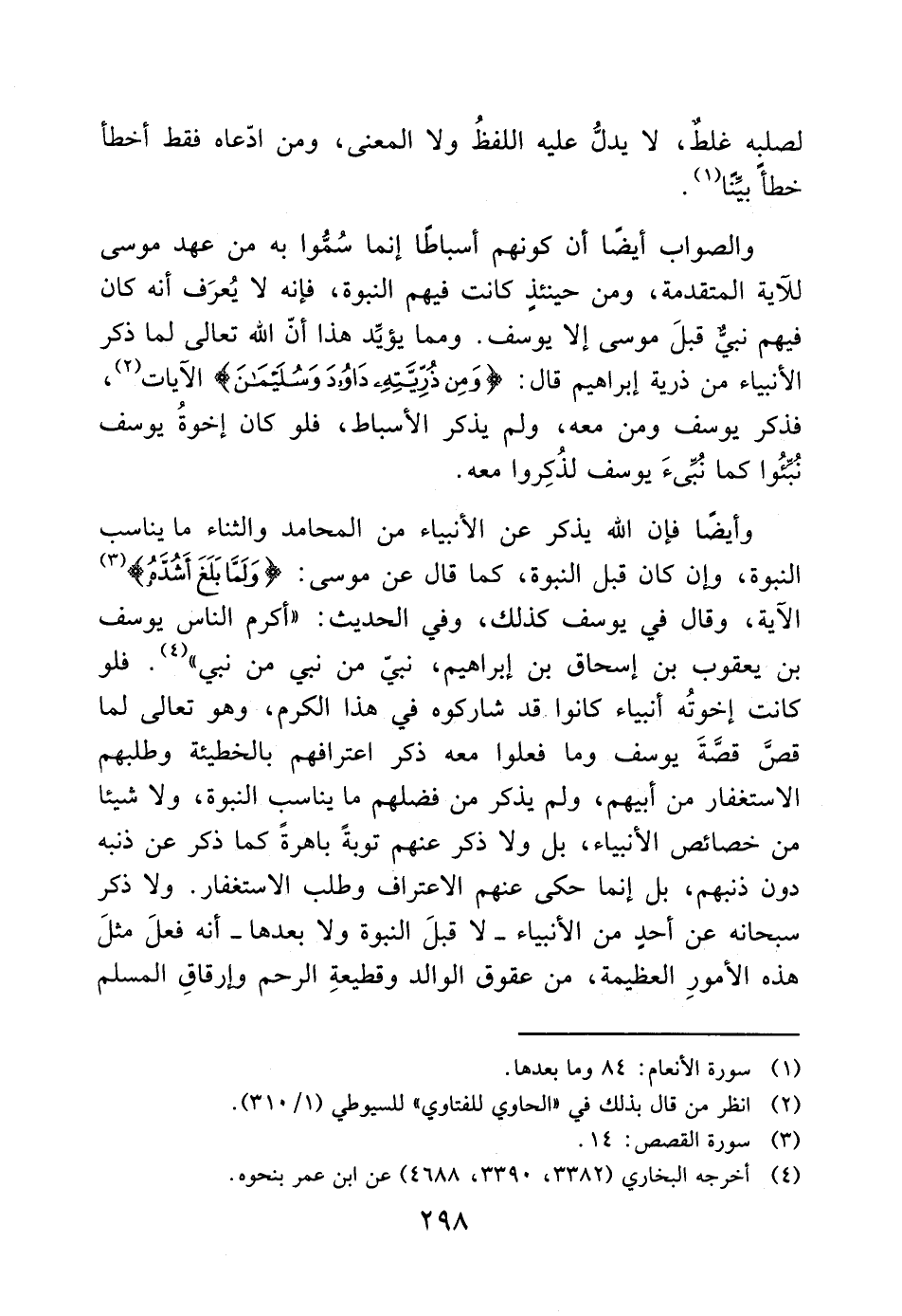 وأيضًا فإن الله يذكر عن الأنبياء من المحامد والثناء ما يناسب النبوة، وإن كان قبل النبوة، كما قال عن موسى: (وَلَمَّا بَلَغَ أَشُدَّهُ) (3) الآية، وقال في يوسف كذلك، وفي الحديث: "أكرم الناس يوسف بن يعقوب بن إسحاق بن إبراهيم، نبيّ من نبي من نبي" (4). فلو كانت إخوتُه أنبياء كانوا قد شاركوه في هذا الكرم، وهو تعالى لما قصَّ قصَّةَ يوسف وما فعلوا معه ذكر اعترافهم بالخطيئة وطلبهم الاستغفار من أبيهم، ولم يذكر من فضلهم ما يناسب النبوة، ولا شيئا من خصائص الأنبياء، بل ولا ذكر عنهم توبةً باهرةً كما ذكر عن ذنبه دون ذنبهم، بل إنما حكى عنهم الاعتراف وطلب الاستغفار. ولا ذكر سبحانه عن أحدٍ من الأنبياء -لا قبلَ النبوة ولا بعدها- أنه فعلَ مثلَ هذه الأمورِ العظيمة، من عقوق الوالد وقطيعةِ الرحم وإرقاقِ المسلم