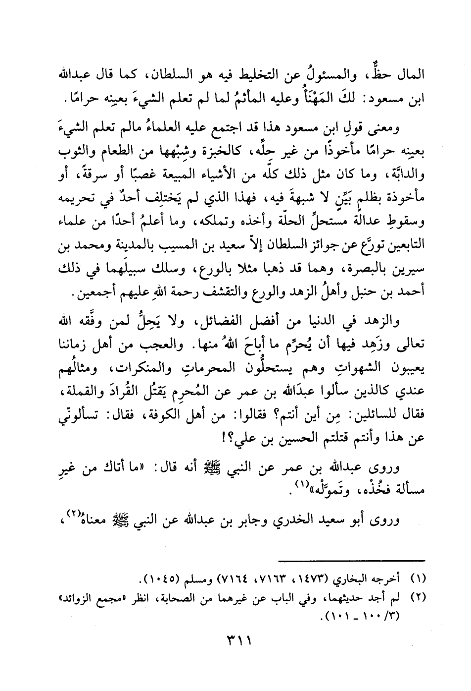 المال حظٌّ، والمسئولُ عن التخليط فيه هو السلطان، كما قال عبد الله ابن مسعود: لكَ المَهْنَاُ وعليه المأثمُ لما لم تعلم الشيءَ بعيِنه حرامًا.