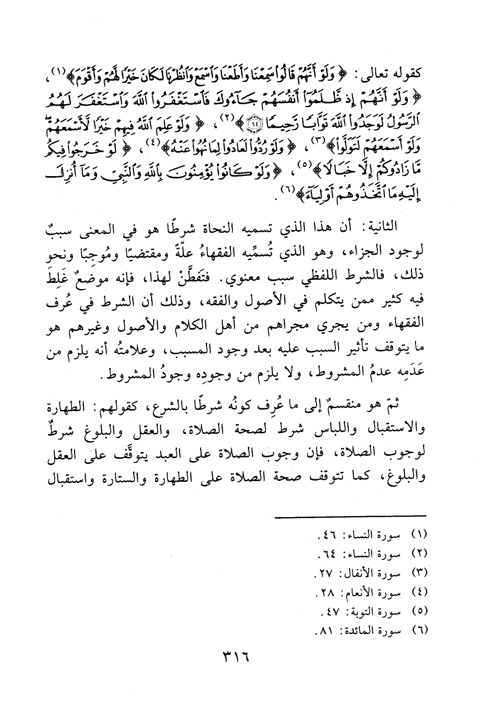 الثانية: أن هذا الذي تسميه النحاة شرطًا هو في المعنى سببٌ لوجود الجزاء، وهو الذي تُسمِّيه الفقهاءُ علّةً ومقتضيًا ومُوجِبًا ونحو ذلك، فالشرط اللفظي سبب معنوي. فتَفطَّنْ لهذا، فإنه موضع غَلِطَ فيه كثير ممن يتكلم في الأصول والفقه، وذلك أن الشرط في عُرف الفقهاء ومن يجري مجراهم من أهل الكلام والأصول وغيرهم هو ما يتوقف تأثير السبب عليه بعد وجود المسبب، وعلامتُه أنه يلزم من عَدَمِه عدمُ المشروط، ولا يلزم من وجودِه وجودُ المشروط.