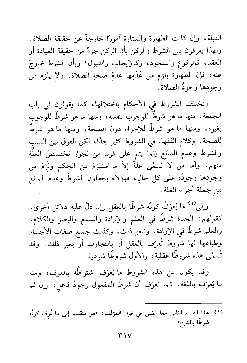 وإلى (1) ما يُعرَفُ كونُه شرطًا بالعقل وإن دلَّ عليه دلائل أخرى، كقولهم: الحياة شرط في العلم والإرادة والسمع والبصر والكلام، والعلم شرط في الإرادة، ونحو ذلك، وكذلك جميع صفات الأجسام وطباعها لها شروط تُعرَف بالعقل أو بالتجارب أو بغير ذلك. وقد تُسمَّى هذه شروطًا عقلية، والأول شروطًا شرعية.