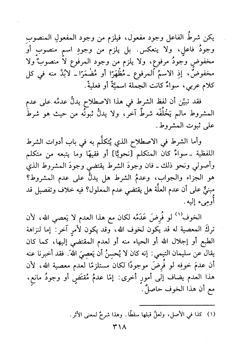 وأما الشرط في الاصطلاح الذي يتكلَّم به في باب أدوات الشرط اللفظية -سواءٌ كان المتكلم [نحويًّا] أو فقيهًا وما يتبعه من متكلم وأصولي ونحو ذلك- فان وجودَ الشرط يقتضي وجودَ المشروط الذي هو الجزاء والجواب، وعدمُ الشرط هل يدلُّ على عدم المشروط؟ مبنيٌّ على أن عدم العلَّة هل يقتضي عدم المعلول؟ فيه خلاف وتفصيل قد أُومِئ إليه.
