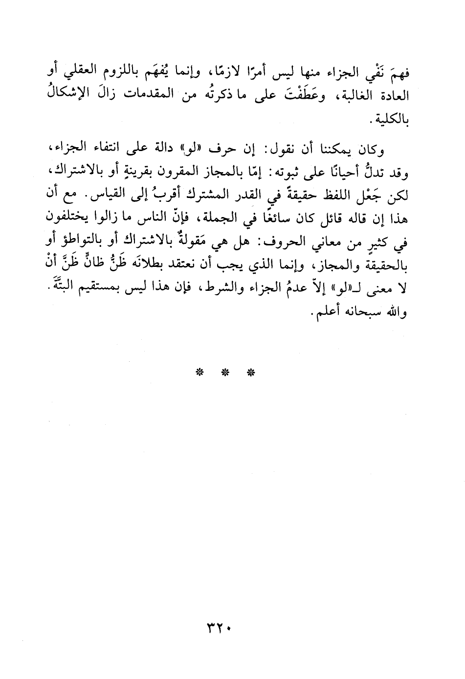 وكان يمكننا أن نقول: إن حرف "لو" دالة على انتفاء الجزاء، وقد تدلُّ أحيانا على ثبوته: إمّا بالمجاز المقرون بقرينةٍ أو بالاشتراك، لكن جَعْل اللفظ حقيقةً في القدر المشترك أقربُ إلى القياس. مع أن هذا إن قاله قائل كان سائغًا في الجملة، فإنّ الناس ما زالوا يختلفون في كثيرٍ من معاني الحروف: هل هي مَقولةٌ بالاشتراك أو بالتواطؤ أو بالحقيقة والمجاز، وإنما الذي يجب أن نعتقد بطلانَه ظَنُّ ظانٍّ ظَنَّ أنْ لا معنى لـ "لو" إلا عدمُ الجزاء والشرط، فإن هذا ليس بمستقيم البتَّةَ. والله سبحانه أعلم.