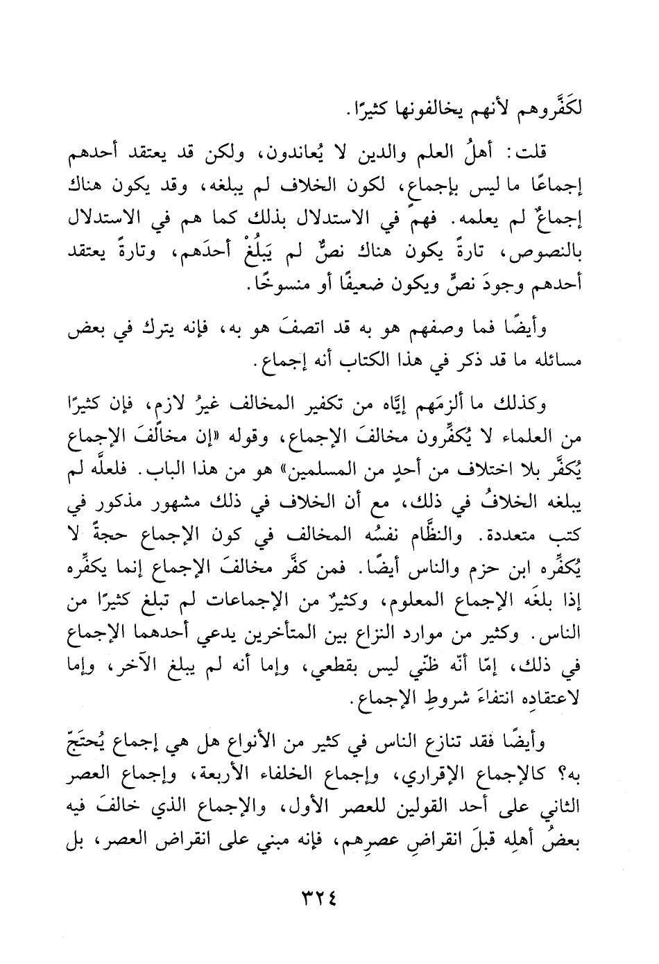 وكذلك ما ألزمَهم إيَّاه من تكفير المخالف غيرُ لازمٍ، فإن كثيرًا من العلماء لا يُكفِّرون مخالفَ الإجماع، وقوله "إن مخالفَ الإجماع يُكفَّر بلا اختلاف من أحدٍ من المسلمين" هو من هذا الباب. فلعلَّه لم يبلغه الخلافُ في ذلك، مع أن الخلاف في ذلك مشهور مذكور في كتب متعددة. والنظَّام نفسُه المخالف في كون الإجماع حجةً لا يُكفِّره ابن حزم والناس أيضًا. فمن كفَّر مخالفَ الإجماع إنما يكفِّره إذا بلغَه الإجماع المعلوم، وكثير من الإجماعات لم تبلغ كثيرًا من الناس. وكثير من موارد النزاع بين المتأخرين يدعي أحدهما الإجماع في ذلك، إمّا أنّه ظنّي ليس بقطعي، وإما أنه لم يبلغ الآخر، وإما لاعتقادِه انتفاءَ شروطِ الإجماع.