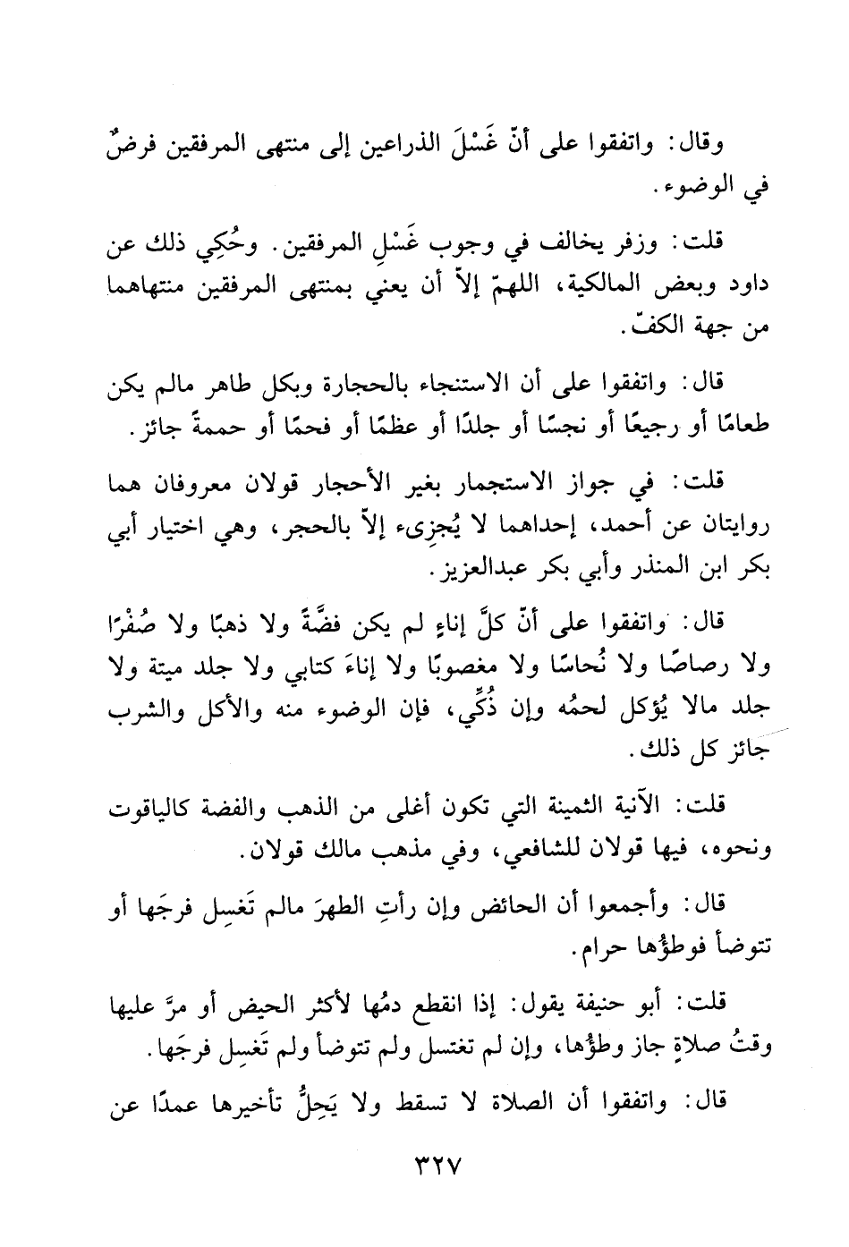 وقال: واتفقوا على أنّ غَسْلَ الذراعين إلى منتهى المرفقين فرض في الوضوء.