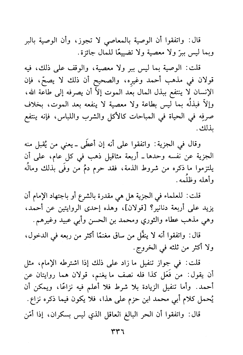 وقال في الجزية: واتفقوا على أنه إن أعطَى -يعني من يُقبل منه الجزية عن نفسه وحدها- أربعة مثاقيل ذهب في كل عام، على أن يلتزموا ما ذكره من شروط الذمة، فقد حرم دمُ من وفَى بذلك ومالُه وأهله وظلُمه.
