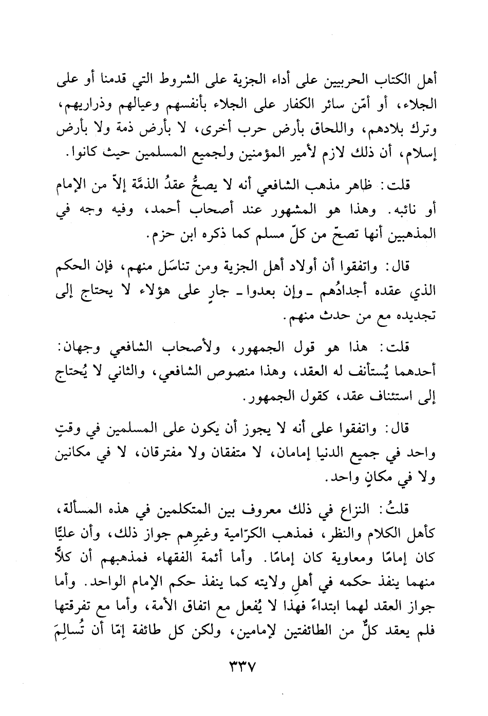 قال: واتفقوا على أنه لا يجوز أن يكون على المسلمين في وقتٍ واحد في جميع الدنيا إمامان، لا متفقان ولا مفترقان، لا في مكانين ولا في مكانٍ واحد.