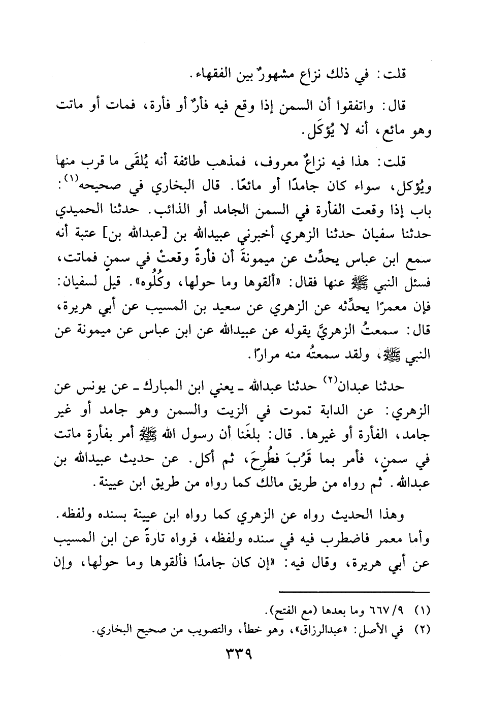 حدثنا عبدان (2) حدثنا عبد الله -يعني ابن المبارك- عن يونس عن الزهري: عن الدابة تموت في الزيت والسمن وهو جامد أو غير جامد، الفأرة أو غيرها. قال: بلغَنا أن رسول الله - صَلَّى اللَّهُ عَلَيْهِ وَسَلَّمَ - أمر بفأرة ماتت في سمنٍ، فأمر بما قَرُبَ فطُرِحَ، ثم أكل. عن حديث عبيد الله بن عبد الله. ثم رواه من طريق مالك كما رواه من طريق ابن عيينة.