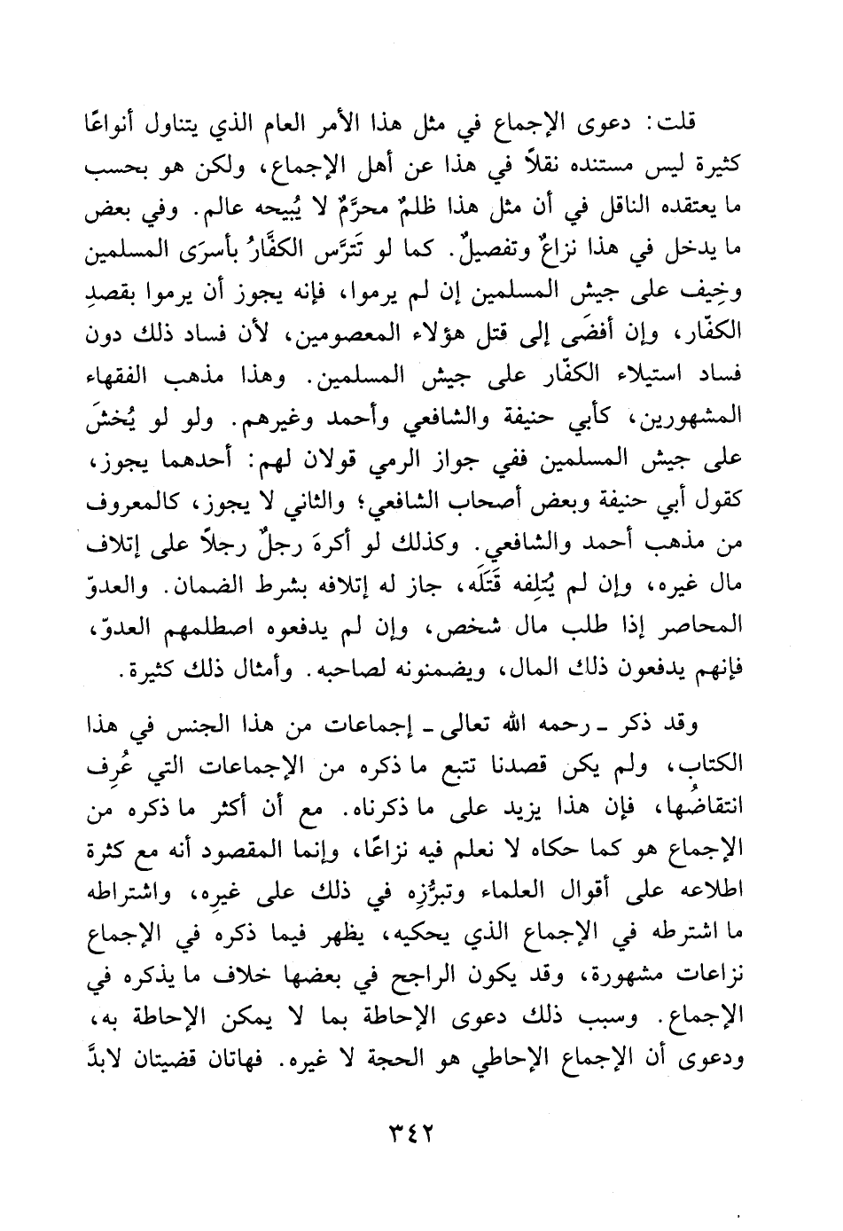 وقد ذكر -رحمه الله تعالى- إجماعات من هذا الجنس في هذا الكتاب، ولم يكن قصدنا تتبع ما ذكره من الإجماعات التي عُرِف انتقاضُها، فإن هذا يزيد على ما ذكرناه. مع أن أكثر ما ذكره من الإجماع هو كما حكاه لا نعلم فيه نزاعًا، وإنما المقصود أنه مع كثرة اطلاعه على أقوال العلماء وتبزُّزِه في ذلك على غيرِه، واشتراطه ما اشترطه في الإجماع الذي يحكيه، يظهر فيما ذكره في الإجماع نزاعات مشهورة، وقد يكون الراجح في بعضها خلاف ما يذكره في الإجماع. وسبب ذلك دعوى الإحاطة بما لا يمكن الإحاطة به، ودعوى أن الإجماع الإحاطي هو الحجة لا غيره. فهاتان قضيتان لابدّ