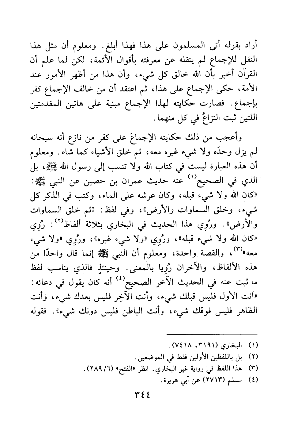 وأعجب من ذلك حكايته الإجماعَ على كفر من نازع أنه سبحانه لم يزل وحدَه ولا شيء غيره معه، ثم خلق الأشياء كما شاء. ومعلوم أن هذه العبارة ليست في كتاب الله ولا تنسب إلى رسول الله - صَلَّى اللَّهُ عَلَيْهِ وَسَلَّمَ -، بل الذي في الصحيح (1) عنه حديث عمران بن حصين عن النبي - صَلَّى اللَّهُ عَلَيْهِ وَسَلَّمَ -: "كان الله ولا شيء قبله، وكان عرشه على الماء، وكتب في الذكر كل شيء، وخلق السماوات والأرض"، وفي لفظ: "ثم خلق السماوات والأرض". ورُوِي هذا الحديث في البخاري بثلاثة ألفاظ (2): رُوِي "كان الله ولا شيء قبله"، ورُوِي "ولا شيء غيره"، ورُوِي "ولا شيء معه" (3)، والقصة واحدة، ومعلوم أن النبي - صَلَّى اللَّهُ عَلَيْهِ وَسَلَّمَ - إنما قال واحدًا من هذه الألفاظ، والآخران رُوِيا بالمعنى. وحينئذٍ فالذي يناسب لفظ ما ثبت عنه في الحديث الآخر الصحيح (4) أنه كان يقول في دعائه: "أنت الأول فليس قبلك شيء، وأنت الآخِر فليس بعدك شيء، وأنت الظاهر فليس فوقك شيء، وأنت الباطن فليس دونك شيء". فقوله
