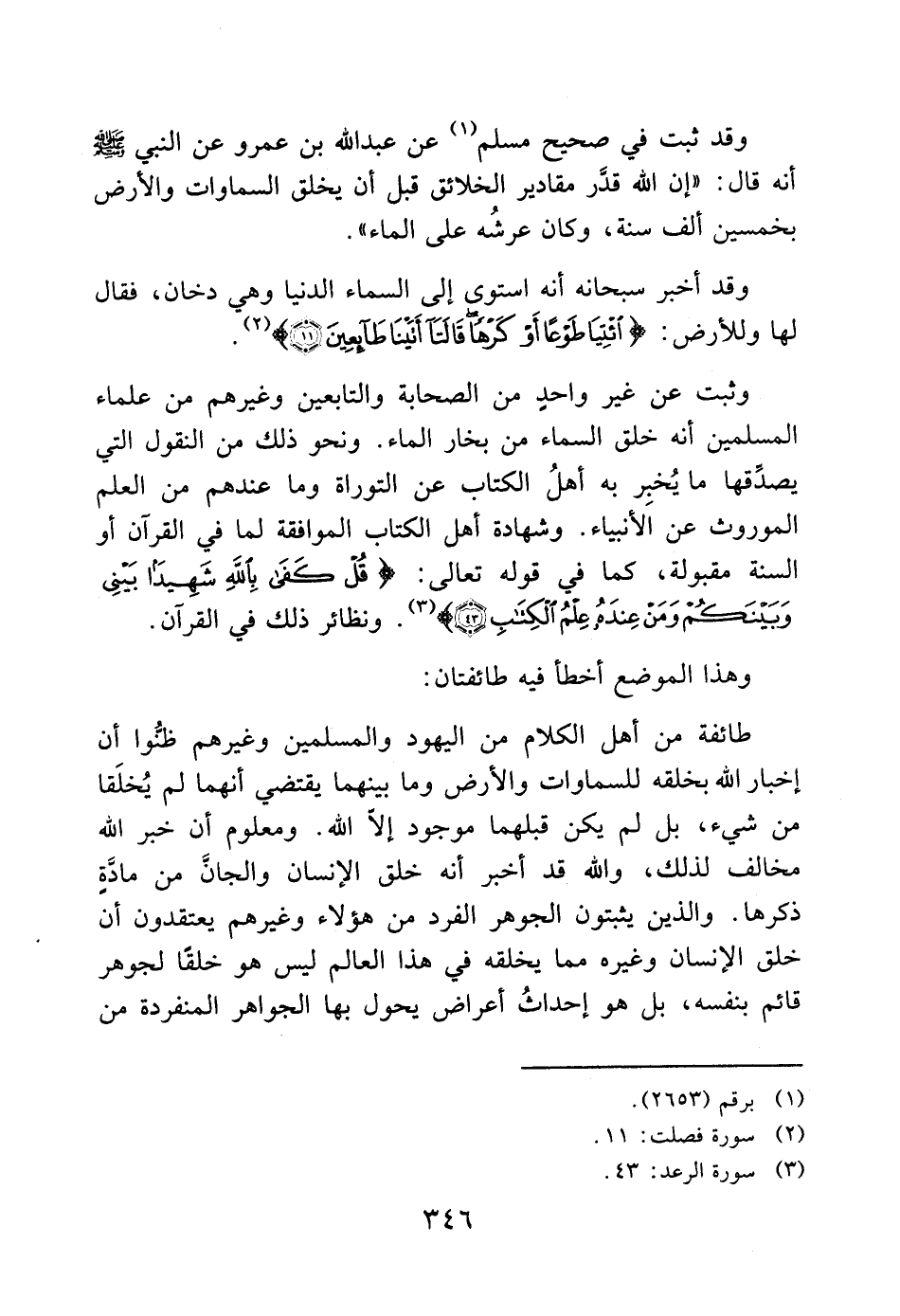 طائفة من أهل الكلام من اليهود والمسلمين وغيرهم ظنُّوا أن إخبار الله بخلقه للسماوات والأرض وما بينهما يقتضي أنهما لم يُخلَقا من شيء، بل لم يكن قبلهما موجود إلا الله. ومعلوم أن خبر الله مخالف لذلك، والله قد أخبر أنه خلق الإنسان والجانَّ من مادَّةٍ ذكرها. والذين يثبتون الجوهر الفرد من هؤلاء وغيرهم يعتقدون أن خلق الإنسان وغيره مما يخلقه في هذا العالم ليس هو خلقًا لجوهر قائم بنفسه، بل هو إحداثُ أعراض يحول بها الجواهر المنفردة من