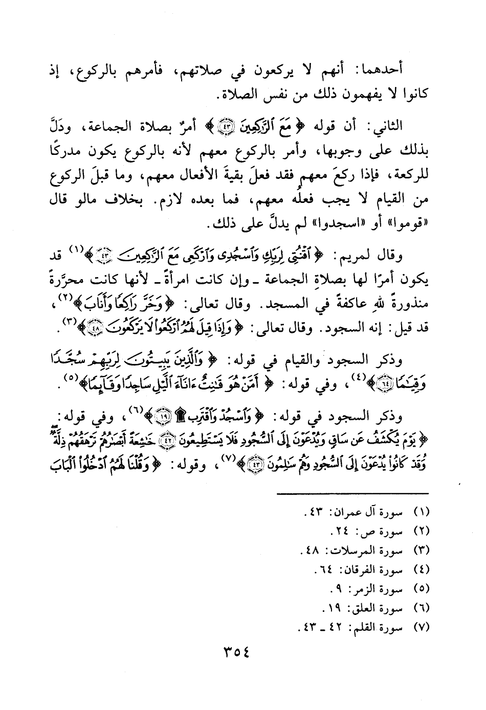 وقال لمريم: (اقْنُتِي لِرَبِّكِ وَاسْجُدِي وَارْكَعِي مَعَ الرَّاكِعِينَ (43)) (1) قد يكون أمرًا لها بصلاةِ الجماعة -وإن كانت امرأةً- لأنها كانت محرَّرةً منذورةً لله عاكفةً في المسجد. وقال تعالى: (وَخَرَّ رَاكِعاً وَأَنَابَ) (2)، قد قيل: إنه السجود. وقال تعالى: (وَإِذَا قِيلَ لَهُمُ ارْكَعُوا لا يَرْكَعُونَ (48)) (3).