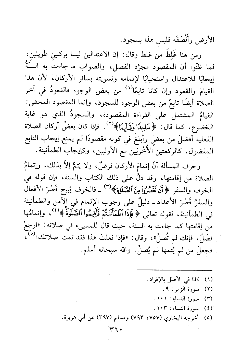 وحرف المسألة أنّ إتمامَ الأركان فرضٌ، ولا يَتمُّ إلا بذلك، وإتمامُ الصلاة من إقامتها، وقد دلَّ على ذلك الكتاب والسنة، فإن قوله في الخوف والسفر (أَنْ تَقْصُرُوا مِنَ الصَّلاةِ) (3) -فالخوف يُبيح قَصْرَ الأفعال والسفرُ قَصْرَ الأعداد- دليلٌ على وجوب الإتمام في الأمن والطمأنينة في الطمأنينة، لقوله تعالى (فَإِذَا اطْمَأْنَنْتُمْ فَأَقِيمُوا الصَّلاةَ) (4)، وإتمامُها من إقامتها كما جاءت به السنة، حيث قال للمسيئ في صلاته: "ارجِعْ فصَلِّ، فإنك لم تُصلِّ"، وقال: "فإذا فعلتَ هذا فقد تمت صلاتك" (5)، فجعلَ من لم يُتمها لم يُصلِّ. والله سبحانه أعلم.