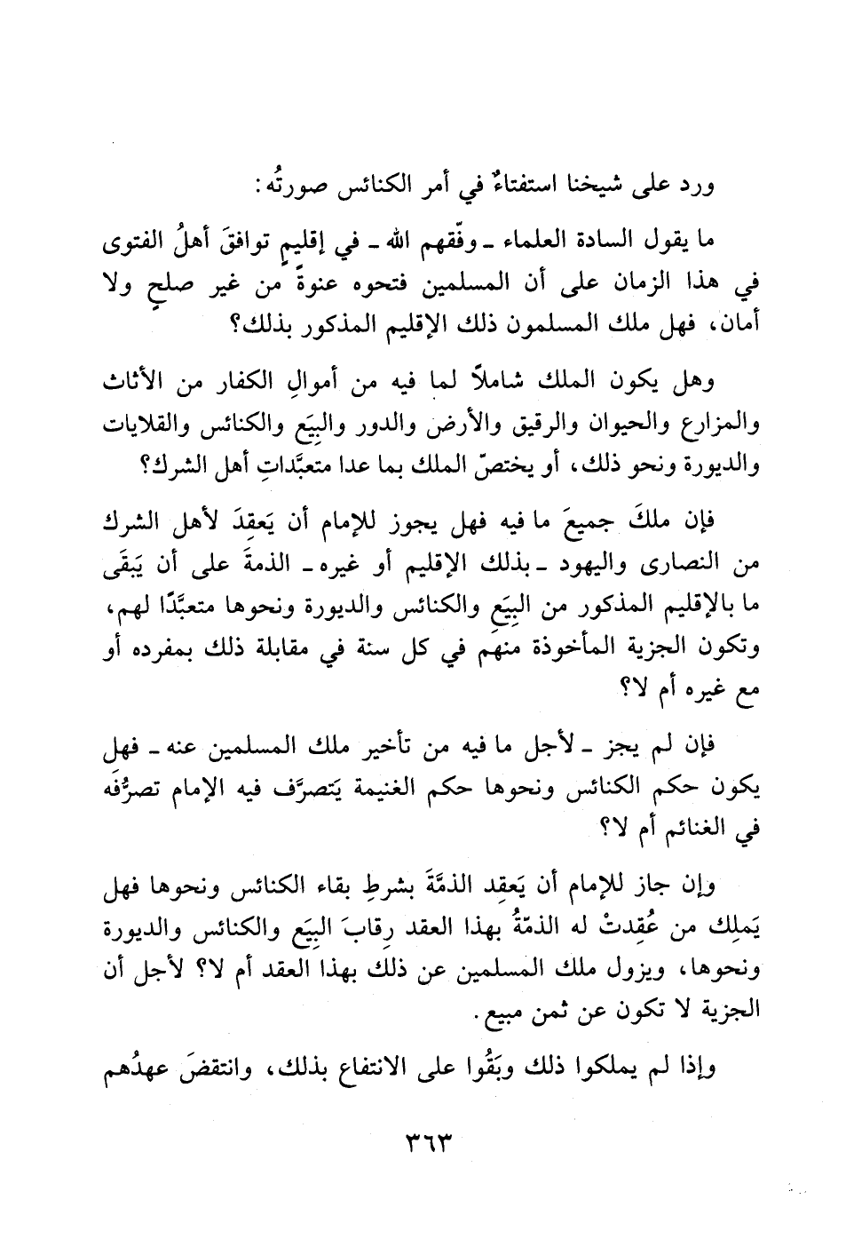 فإن ملكَ جميعَ ما فيه فهل يجوز للإمام أن يَعقِدَ لأهل الشرك من النصارى واليهود -بذلك الإقليم أو غيره- الذمةَ على أن يَبقَى ما بالإقليم المذكور من البِيَعِ والكنائس والديورة ونحوها متعبَّدًا لهم، وتكون الجزية المأخوذة منهم في كل سنة في مقابلة ذلك بمفرده أو مع غيره أم لا؟