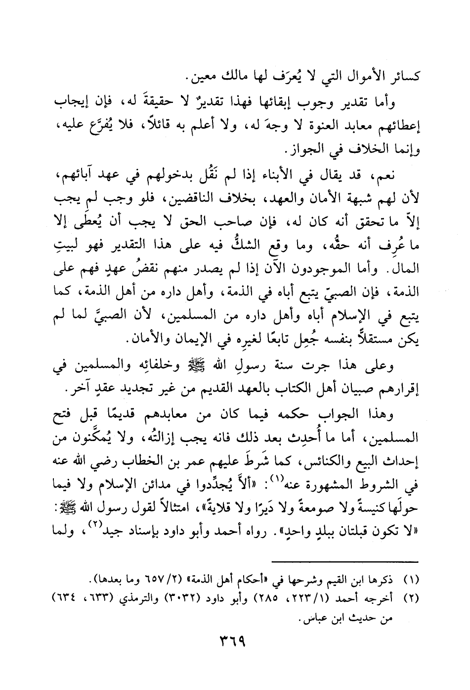 وعلى هذا جرت سنة رسولِ الله - صَلَّى اللَّهُ عَلَيْهِ وَسَلَّمَ - وخلفائِه والمسلمين في إقرارهم صبيان أهل الكتاب بالعهد القديم من غير تجديد عقدٍ آخر. وهذا الجواب حكمه فيما كان من معابدهم قديمًا قبل فتح المسلمين، أما ما أُحدِث بعد ذلك فانه يجب إزالتُه، ولا يُمكِّنون من إحداث البيع والكنائس، كما شَرطَ عليهم عمر بن الخطاب رضي الله عنه في الشروط المشهورة عنه (1): "إلاَّ يُجدِّدوا في مدائن الإسلام ولا فيما حولَها كنيسة ولا صومعة ولا دَيرًا ولا قلايةً"، امتثالاً لقول رسول الله - صَلَّى اللَّهُ عَلَيْهِ وَسَلَّمَ -: "لا تكون قبلتان ببلدٍ واحدٍ". رواه أحمد وأبو داود بإسناد جيد (2)، ولما