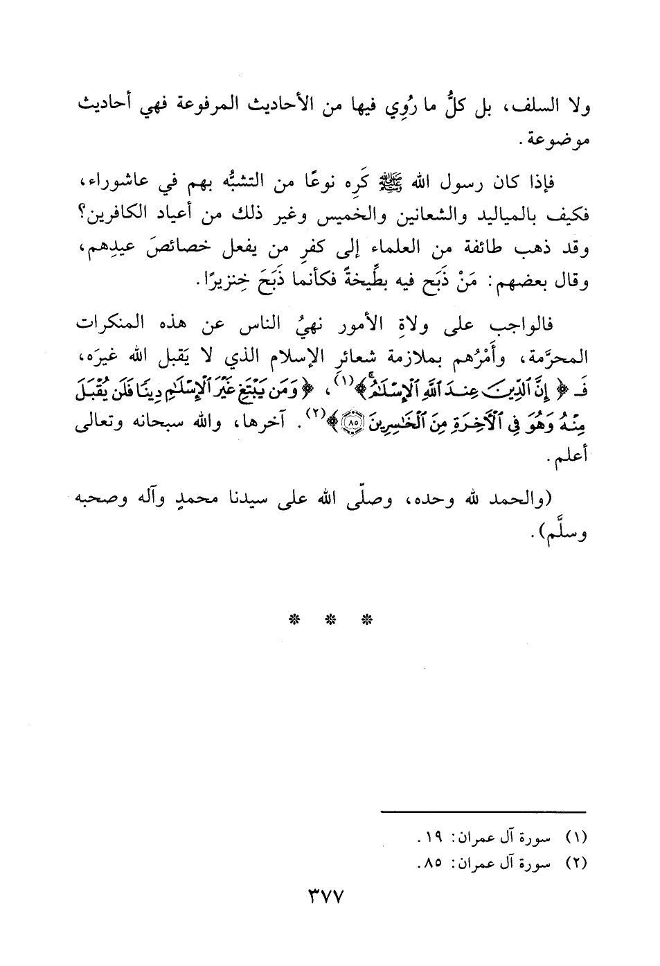 فالواجب على ولاةِ الأمور نهيُ الناس عن هذه المنكرات المحرَّمة، وأَمْرُهم بملازمة شعائر الإسلام الذي لا يَقبل الله غيرَه، فـ (إِنَّ الدِّينَ عِنْدَ اللَّهِ الْأِسْلامُ) (1)، (وَمَنْ يَبْتَغِ غَيْرَ الْأِسْلامِ دِيناً فَلَنْ يُقْبَلَ مِنْهُ وَهُوَ فِي الْآخِرَةِ مِنَ الْخَاسِرِينَ (85)) (2). آخرها، والله سبحانه وتعالى أعلم.