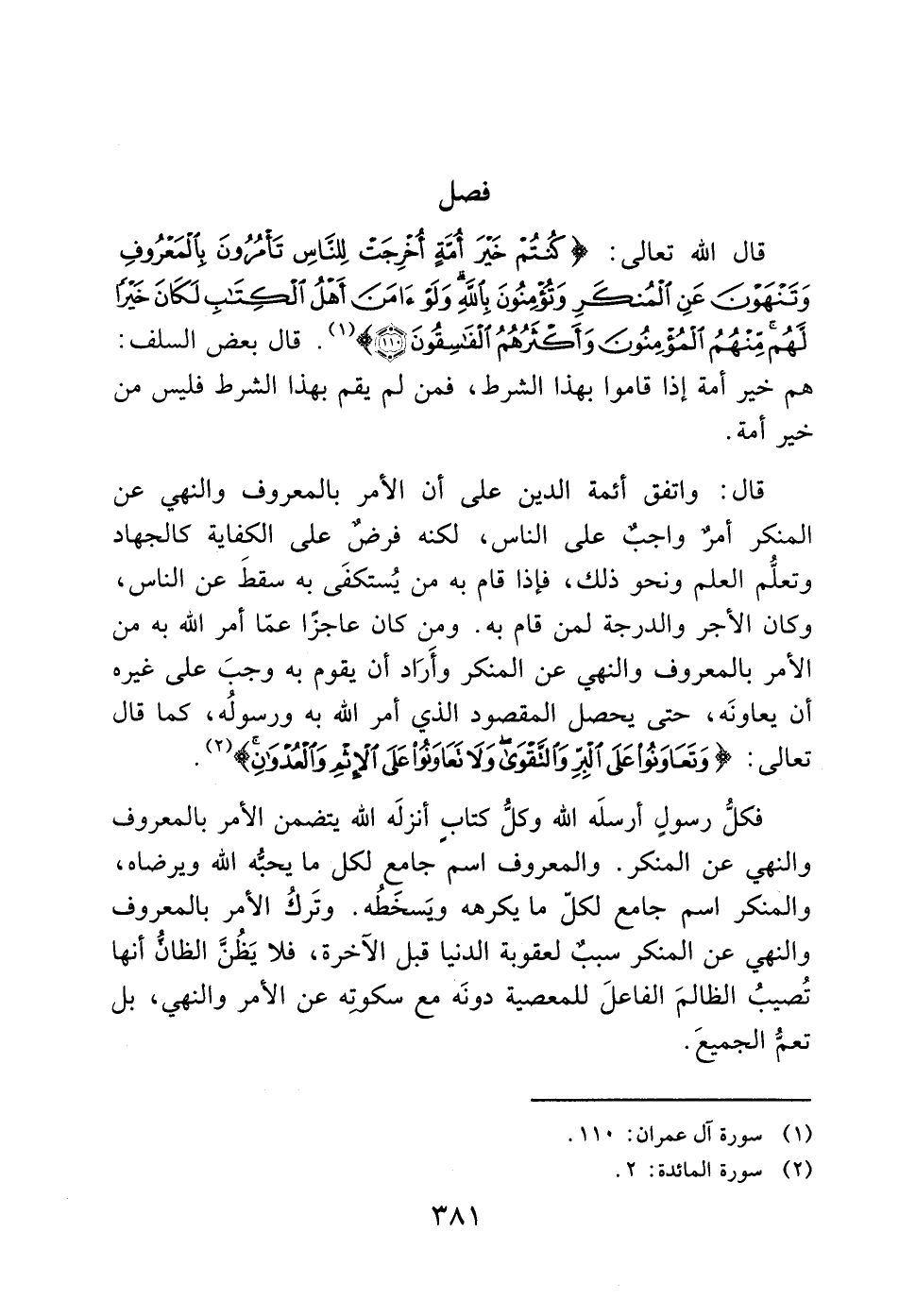 قال: واتفق أئمة الدين على أن الأمر بالمعروف والنهي عن المنكر أمرٌ واجبٌ على الناس، لكنه فرضٌ على الكفاية كالجهاد وتعلُّم العلم ونحو ذلك، فإذا قام به من يُستكفَى به سقطَ عن الناس، وكان الأجر والدرجة لمن قام به. ومن كان عاجزًا عمّا أمر الله به من الأمر بالمعروف والنهي عن المنكر وأَرَاد أن يقوم به وجبَ على غيره أن يعاونَه، حتى يحصل المقصود الذي أمر الله به ورسولُه، كما قال تعالى: (وَتَعَاوَنُوا عَلَى الْبِرِّ وَالتَّقْوَى وَلا تَعَاوَنُوا عَلَى الْأِثْمِ وَالْعُدْوَانِ) (2).