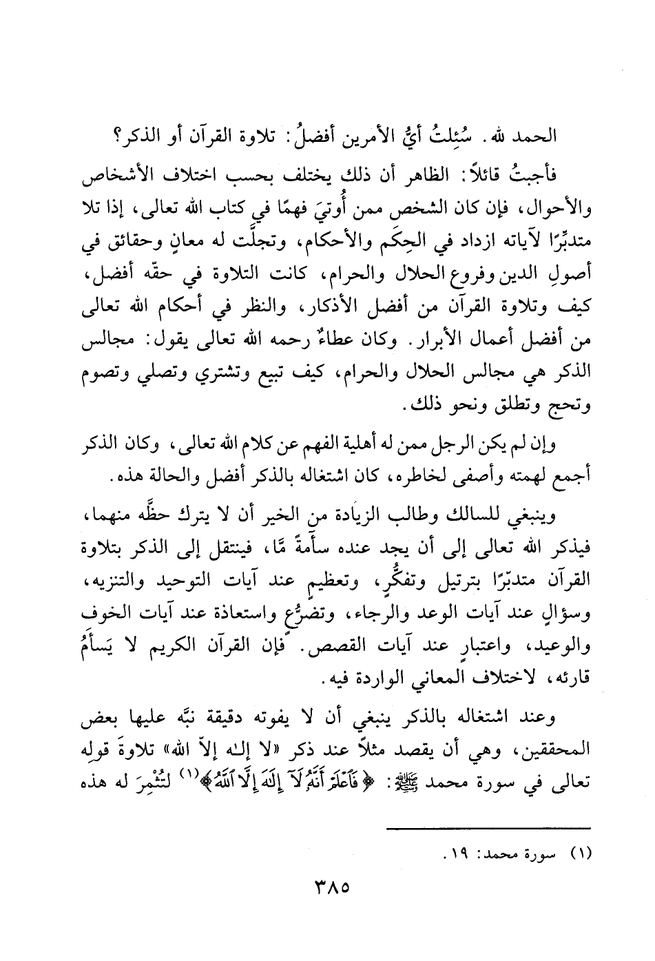 فأجبتُ قائلاً: الظاهر أن ذلك يختلف بحسب اختلاف الأشخاص والأحوال، فإن كان الشخص ممن أُوتيَ فهمًا في كتاب الله تعالى، إذا تلا متدبِّرًا لآياته ازداد في الحِكَم والأحكام، وتجلَّت له معانٍ وحقائق في أصولِ الدين وفروع الحلال والحرام، كانت التلاوة في حقّه أفضل، كيف وتلاوة القرآن من أفضل الأذكار، والنظر في أحكام الله تعالى من أفضل أعمال الأبرار. وكان عطاءٌ لا رحمه الله تعالى يقول: مجالس الذكر هي مجالس الحلال والحرام، كيف تبيع وتشتري وتصلي وتصوم وتحج وتطلق ونحو ذلك.