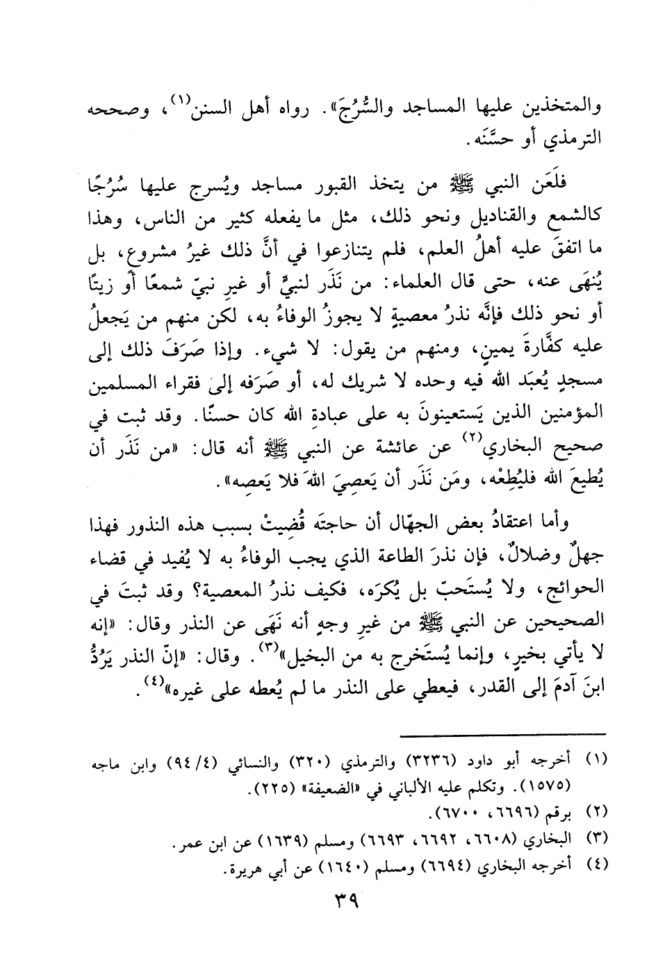فلَعَن النبي - صَلَّى اللَّهُ عَلَيْهِ وَسَلَّمَ - من يتخذ القبور مساجد ويُسرج عليها سُرُجًا كالشمع والقناديل ونحو ذلك، مثل ما يفعله كثير من الناس، وهذا ما اتفقَ عليه أهلُ العلم، فلم يتنازعوا في أنَّ ذلك غيرُ مشروع، بل يُنهَى عنه، حتى قال العلماء: من نَذَر لنبي أو غيرِ نبيّ شمعًا أو زيتًا أو نحو ذلك فإنَّه نذرُ معصيةٍ لا يجوزُ الوفاءُ به، لكن منهم من يَجعلُ عليه كفَّارةَ يمينٍ، ومنهم من يقول: لا شيء. وإذا صَرَفَ ذلك إلى مسجدٍ يُعبَد الله فيه وحده لا شريك له، أو صَرَفه إلى فقراء المسلمين المؤمنين الذين يَستعينونَ به على عبادةِ الله كان حسنًا. وقد ثبت في صحيح البخاري (2) عن عائشة عن النبي - صَلَّى اللَّهُ عَلَيْهِ وَسَلَّمَ - أنه قال: "من نَذَر أن يُطيعَ الله فليُطِعْه، ومَن نَذَر أن يَعصِيَ اللهَ فلا يَعصِه".