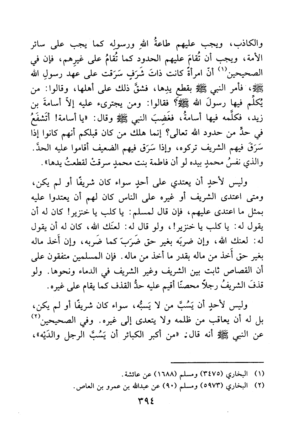 وليس لأحدٍ أن يعتدي على أحدٍ سواء كان شريفًا أو لم يكن، ومتى اعتدى الشريف أو غيره على الناس كان لهم أن يعتدوا عليه بمثل ما اعتدى عليهم، فإن قال لمسلم: يا كلب يا خنزير! كان له أن يقول له: يا كلب يا خنزير!، ولو قال له: لعنَك الله، كان له أن يقول له: لعنك الله، وإن ضربَه بغير حق ضَرَبَ كما ضَربه، وإن أَخذ ماله بغير حق أَخذ من ماله بقدر ما أخذ من ماله. فإن المسلمين متفقون على أن القصاص ثابت بين الشريف وغير الشريف في الدماء ونحوها. ولو قذفَ الشريفُ رجلاً محصنًا أقيم عليه حدُّ القذف كما يقام على غيره. وليس لأحدٍ أن يَسُبَّ من لا يَسبَّ، سواء كان شريفًا أو لم يكن، بل له أن يعاقب من ظلمه ولا يتعدى إلى غيره. وفي الصحيحين (2) عن النبي - صَلَّى اللَّهُ عَلَيْهِ وَسَلَّمَ - أنه قال: "من أكبر الكبائر أن يَسُبَّ الرجل والدَيْه"،