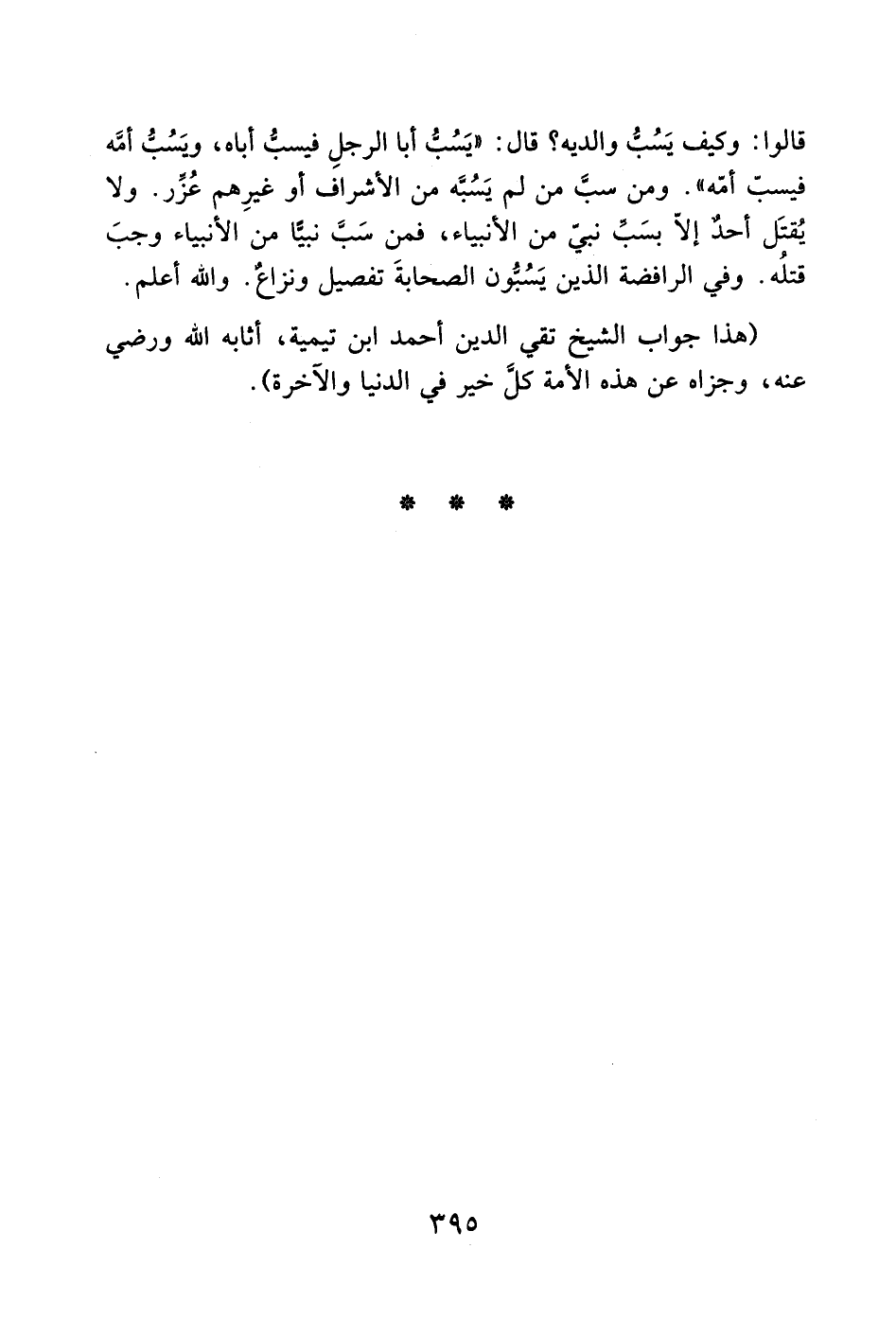 قالوا: وكيف يَسُبُّ والديه؟ قال: "يَسُبُّ أبا الرجلِ فيسبُّ أباه، ويَسُبُّ أمَّه فيسبّ أمّه". ومن يسبَّ من لم يَسُبَّه من الأشراف أو غيرِهم عُزِّر. ولا يُقتَل أحدٌ إلا بسَبّ نبيّ من الأنبياء، فمن يسَبَّ نبيًّا من الأنبياء وجبَ قتلُه. وفي الرافضة الذين يَسُبُّون الصحابةَ تفصيل ونزاعٌ. والله أعلم. (هذا جواب الشيخ تقي الدين أحمد ابن تيمية، أثابه الله ورضي عنه، وجزاه عن هذه الأمة كل خير في الدنيا والآخرة).