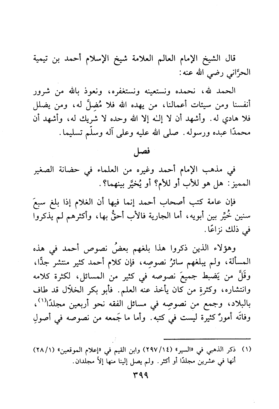 فإن عامة كتب أصحاب أحمد إنما فيها أن الغلام إذا بلغ سبعَ سنين خُيِّر بين أبويه، أما الجارية فالأب أحقُّ بها، وأكثرهم لم يذكروا في ذلك نزاعًا.
